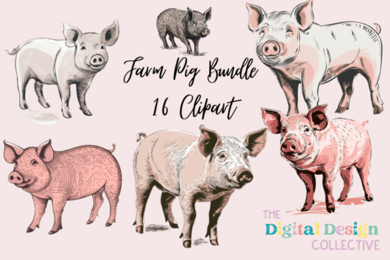 Enhance your creative projects with the Adorable Farm Pig Clipart Bundle, featuring charming pig designs perfect for farm-themed crafts, nursery decor, and playful invitations.