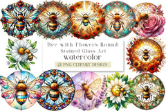 Bee and Flowers Stained Glass Art Clipart Bundle