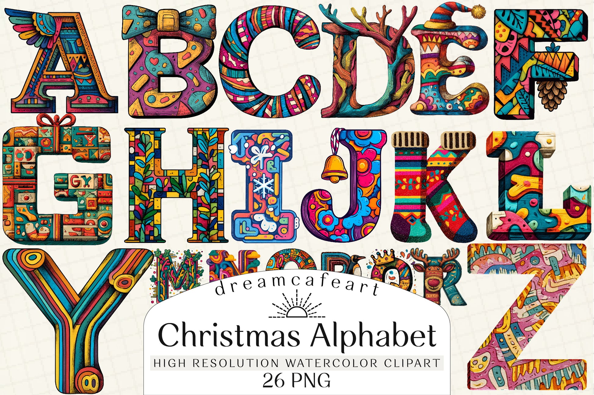 Unleash your creativity with our Christmas Alphabet Letter Clipart Bundle, perfect for festive projects and holiday crafts. Featuring beautifully designed letters adorned with seasonal motifs, this bundle is ideal for personalized Christmas cards, gift tags, and decorations. Transform your holiday creations with these versatile and charming clipart letters, perfect for adding a touch of Christmas magic to any project. Whether you're crafting for family, friends, or your own enjoyment, this bundle offers endless possibilities for festive fun. Elevate your holiday designs with our unique and enchanting Christmas Alphabet Letter Clipart Bundle today!