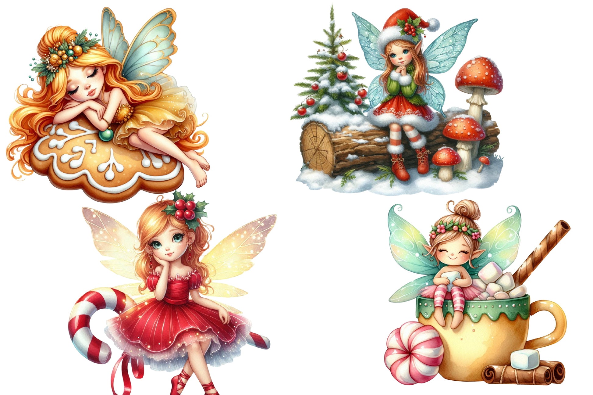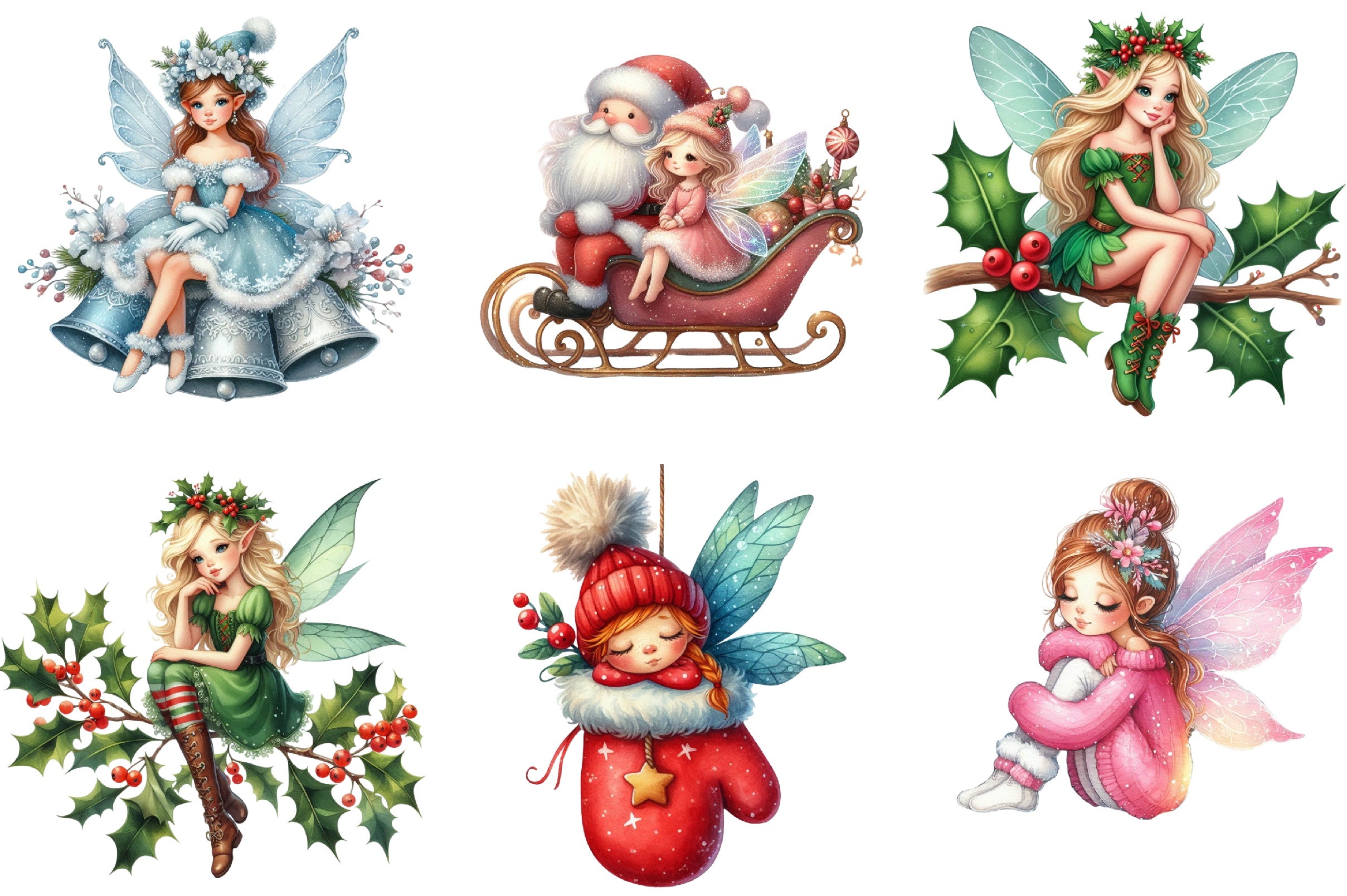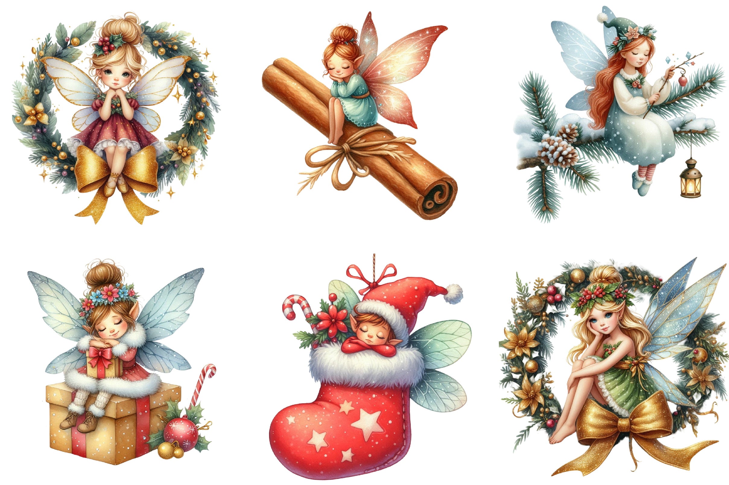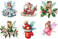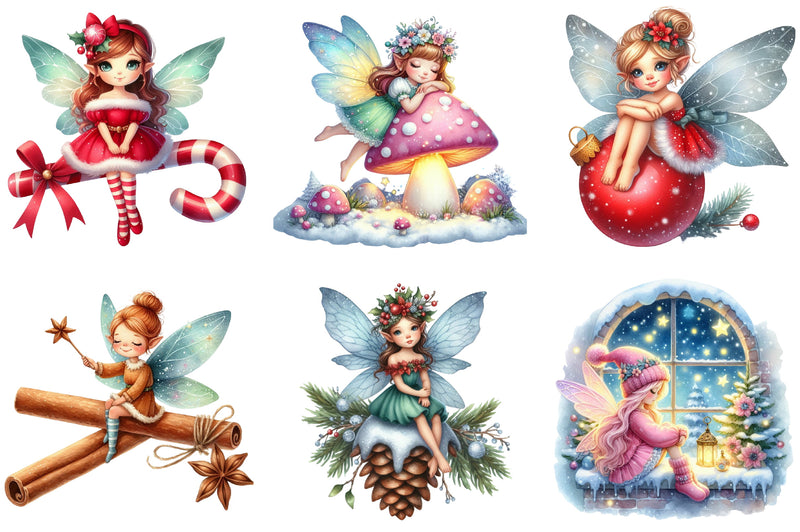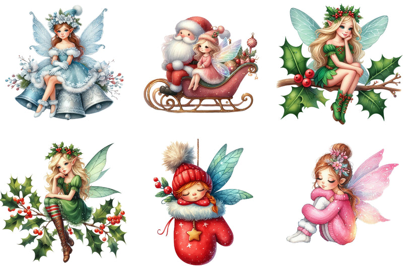 Transform your seasonal creations with this enchanting collection of sitting fairy illustrations, ideal for Christmas cards, gift tags, and more.