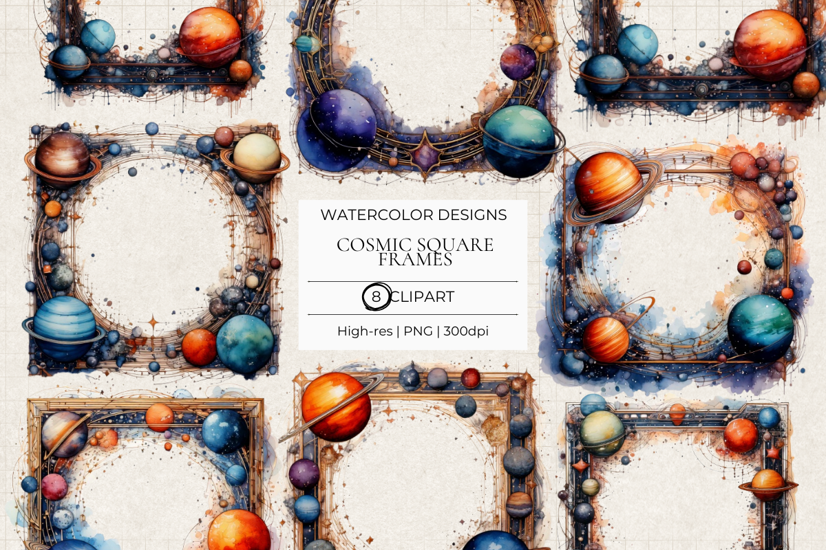 Enhance your creative projects with our Cosmic Square Frames Clipart, featuring stunning celestial designs perfect for digital scrapbooking, invitations, and more. These high-quality, versatile frames add a touch of cosmic elegance to any project, making them ideal for both personal and commercial use. Transform your designs with these unique, eye-catching frames that capture the beauty of the universe.