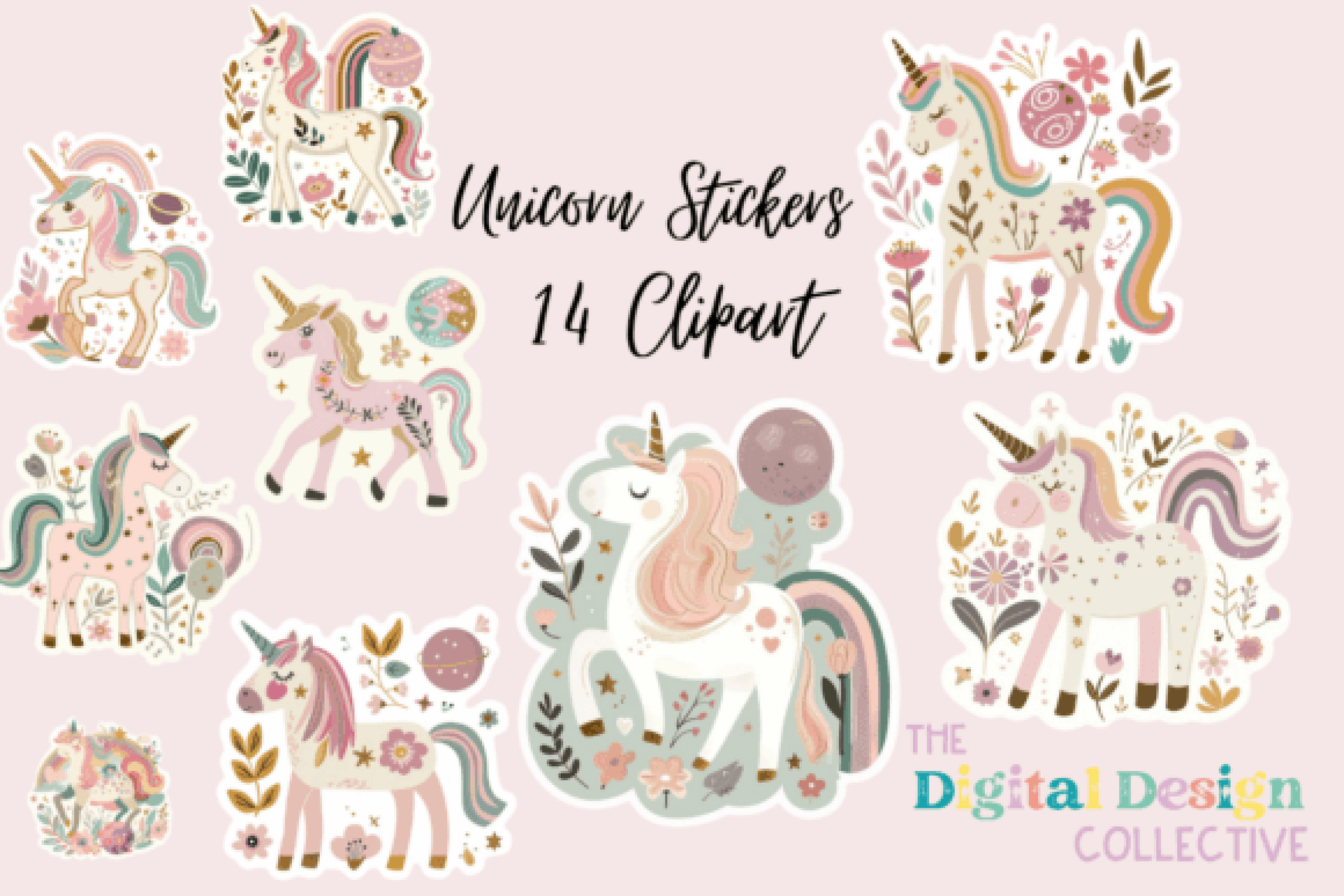 Enhance your creative projects with the Unicorn Floral Sticker Clipart Bundle. This enchanting collection features whimsical unicorn designs adorned with vibrant floral elements, perfect for scrapbooking, card making, and digital crafts. Ideal for adding a touch of magic to your DIY projects, these high-quality cliparts are easy to use and compatible with various design software. Unleash your imagination and transform ordinary crafts into extraordinary creations with this must-have bundle.