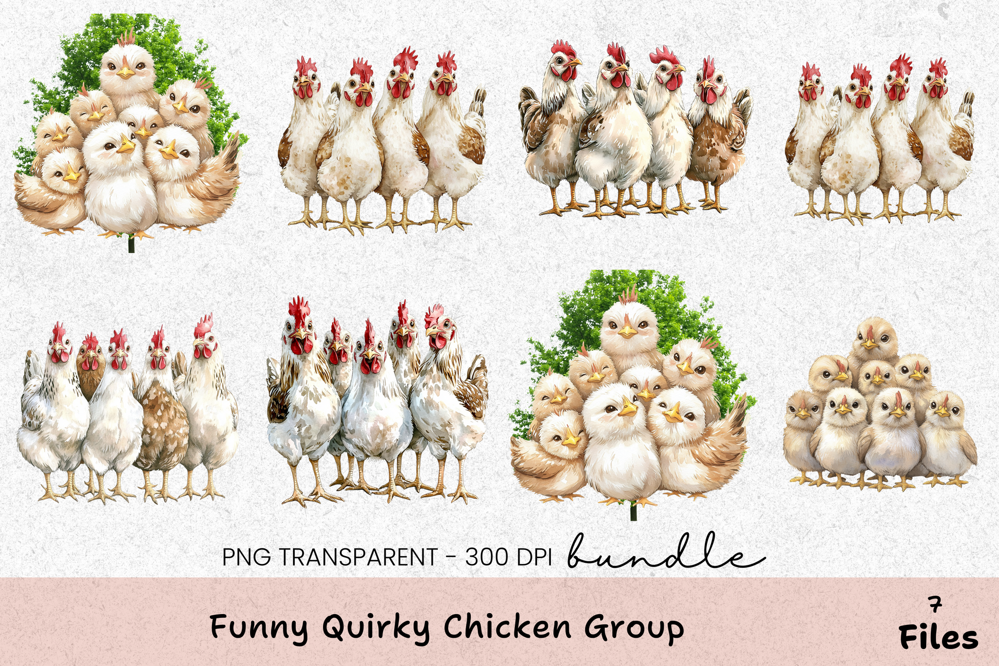 Unleash creativity with our Funny Quirky Chicken Group Clipart Bundle, featuring whimsical chicken designs perfect for unique craft projects and playful decor.