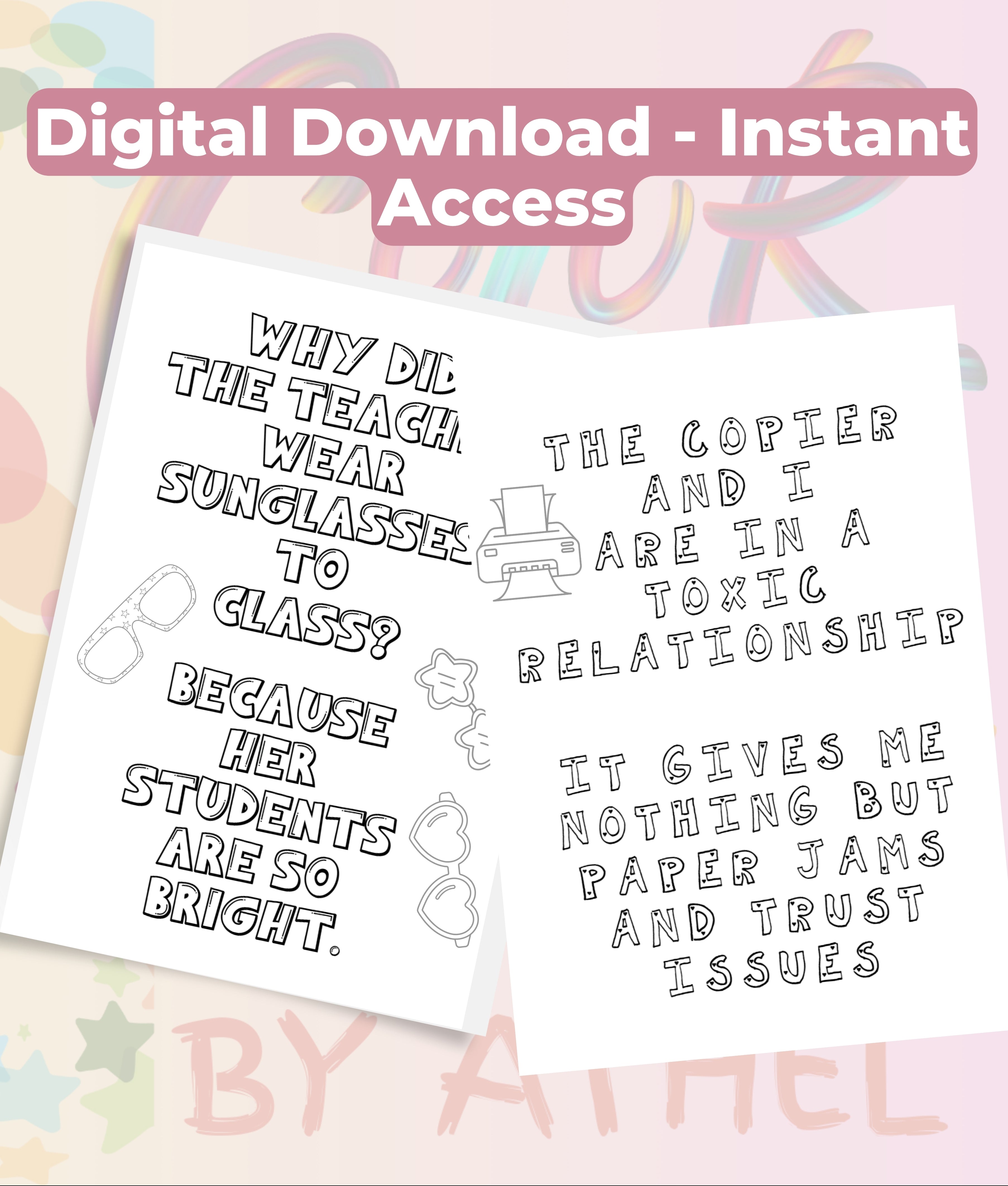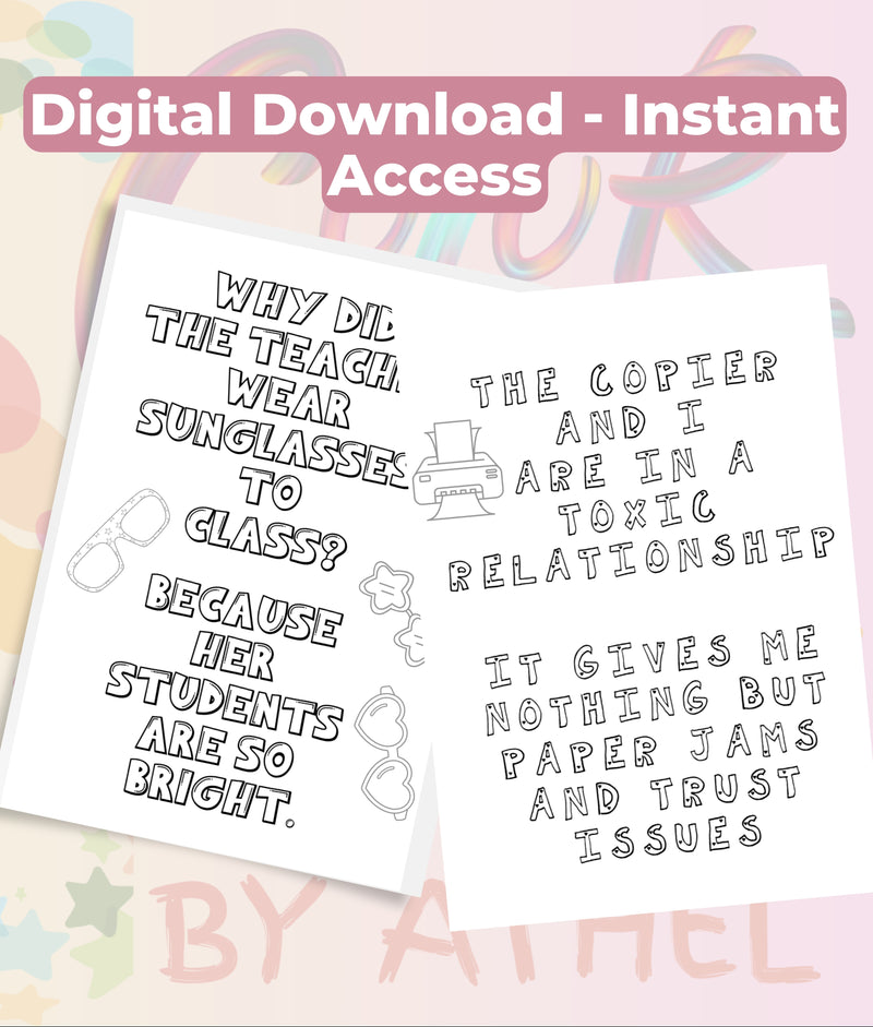 Discover endless laughter with our Funny Teacher Jokes Coloring Book Bundle! Perfect for educators, this bundle features a collection of hilarious teacher-themed jokes and intricate coloring pages. Ideal for stress relief and creative expression, these books make a fantastic gift for teachers or a fun addition to any classroom. Unleash your creativity and humor with this unique coloring experience!