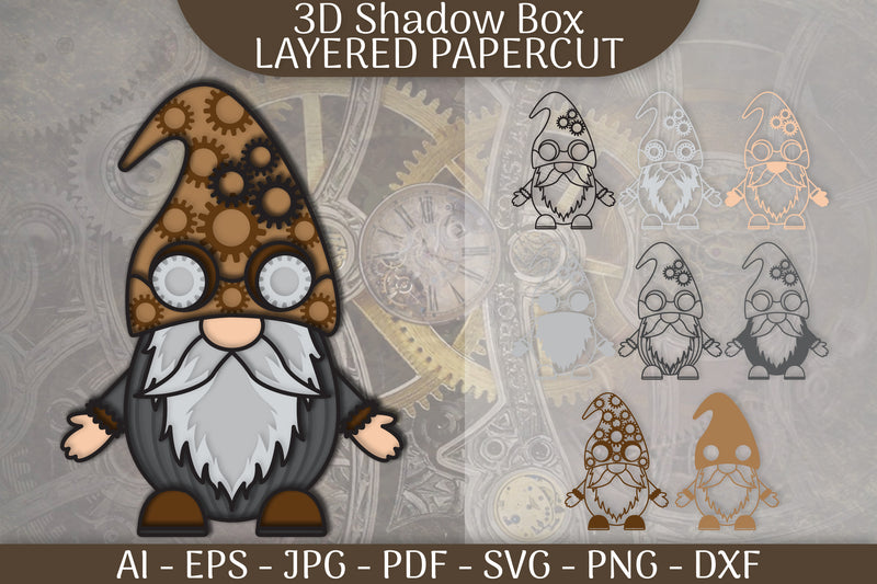 Unleash creativity with the Gnome Steampunk Layered Papercut SVG Bundle, featuring intricate gnome designs perfect for unique crafts and home decor projects.