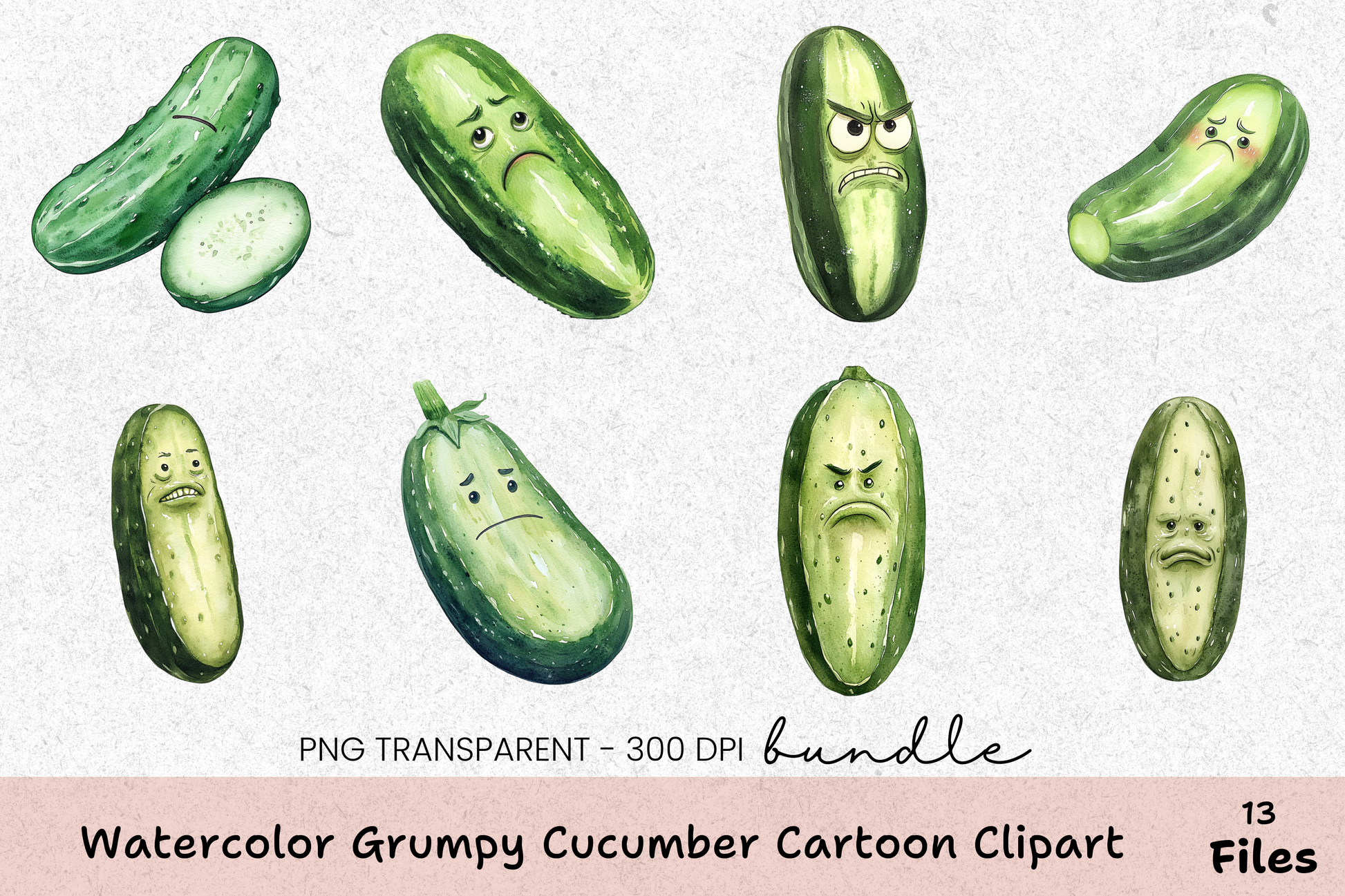 Unleash creativity with the Grumpy Cucumber Cartoon Clipart Bundle, featuring quirky and expressive cucumber designs perfect for playful projects. Ideal for digital scrapbooking, whimsical invitations, and unique merchandise, this bundle adds a touch of humor to any creation. Dive into a world of fun with these high-quality, versatile clipart images, perfect for enhancing your artistic endeavors.