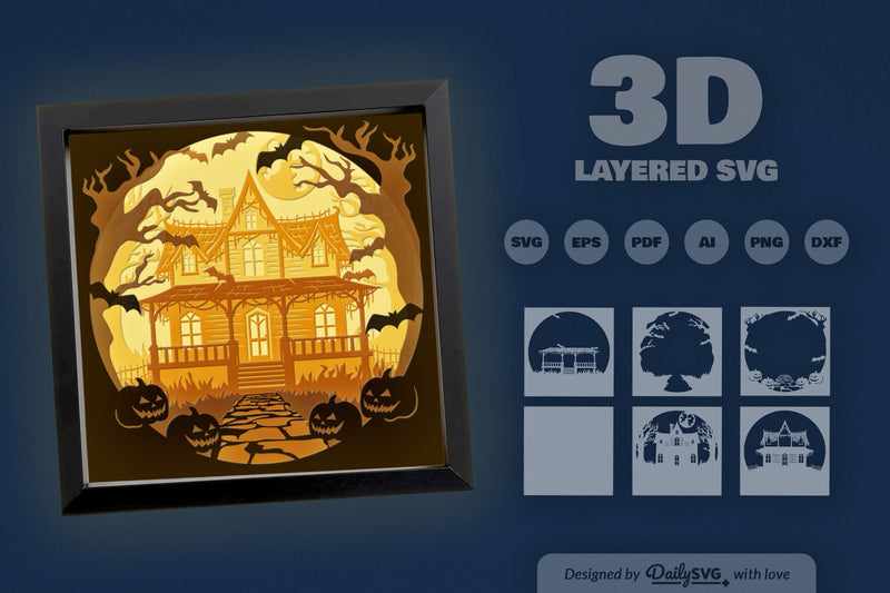 Unleash the spookiness with our Halloween Haunted House Papercut SVG Bundle, featuring intricately designed haunted house patterns perfect for eerie decorations and spine-chilling crafts.