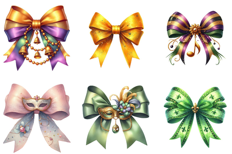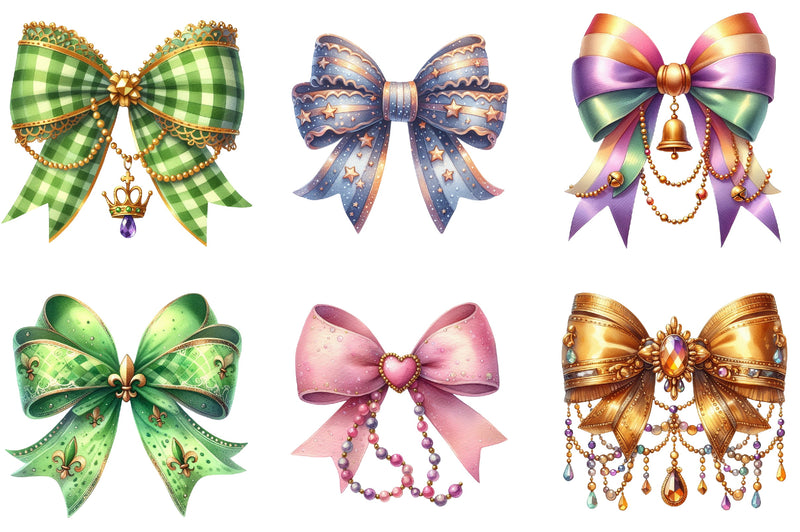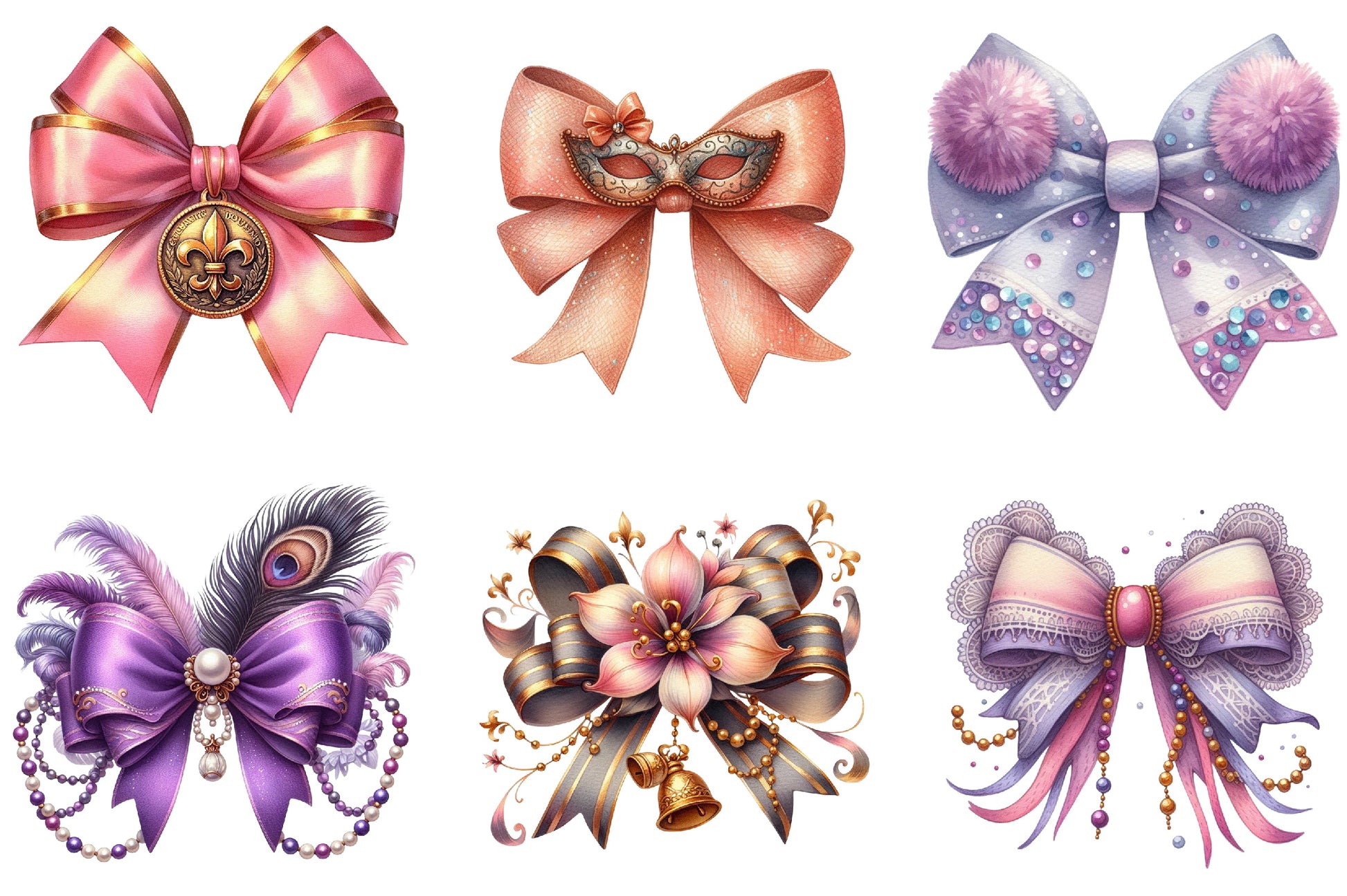 Unleash your creativity with the Mardi Gras Coquette Bow Clipart Bundle, featuring vibrant and festive bow designs perfect for party invitations, scrapbooking, and digital projects. Elevate your crafts with these unique, high-quality clipart elements, ideal for adding a touch of Mardi Gras magic to any creation. Perfect for designers and DIY enthusiasts looking to infuse their work with colorful charm and elegance.
