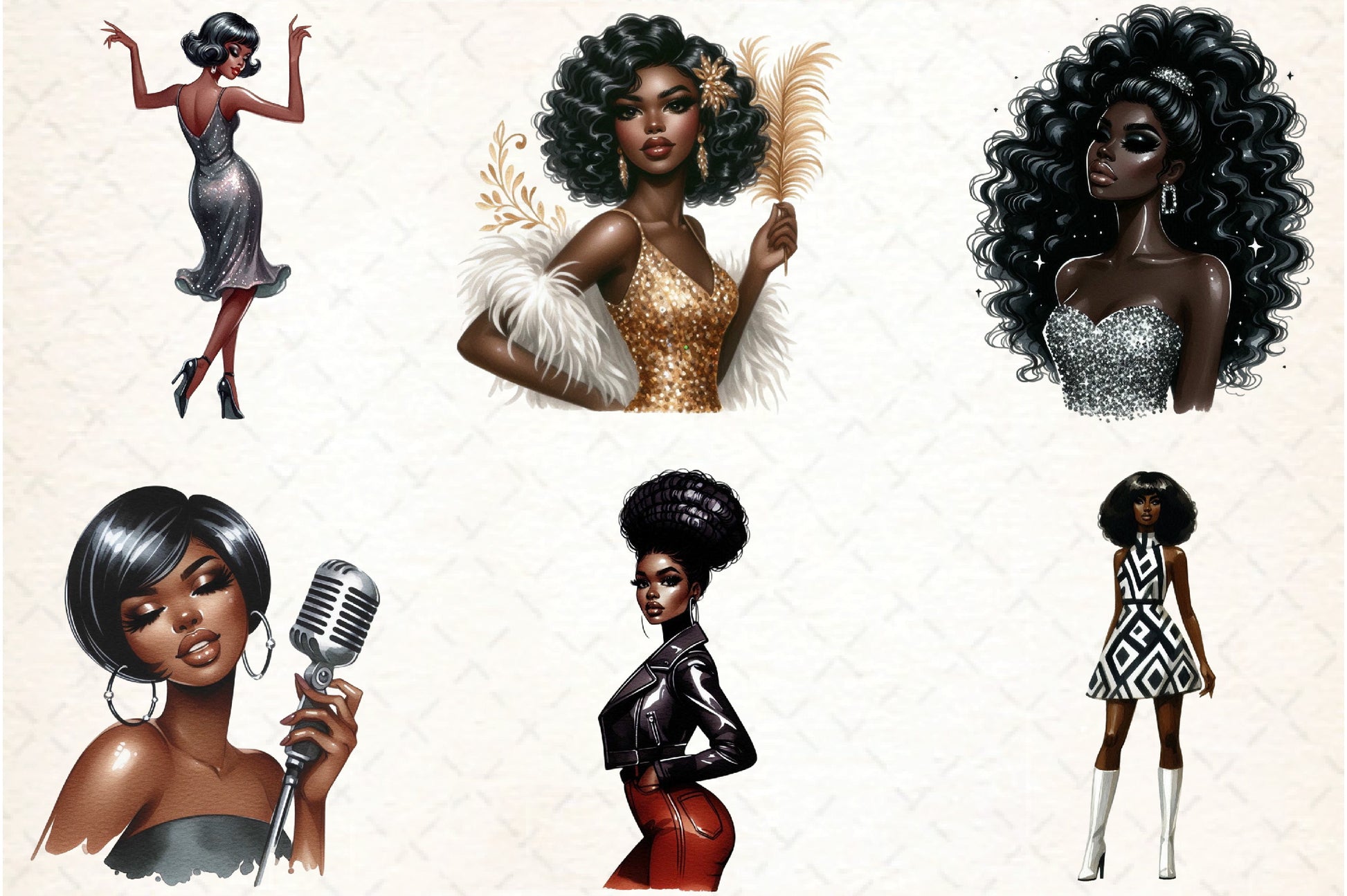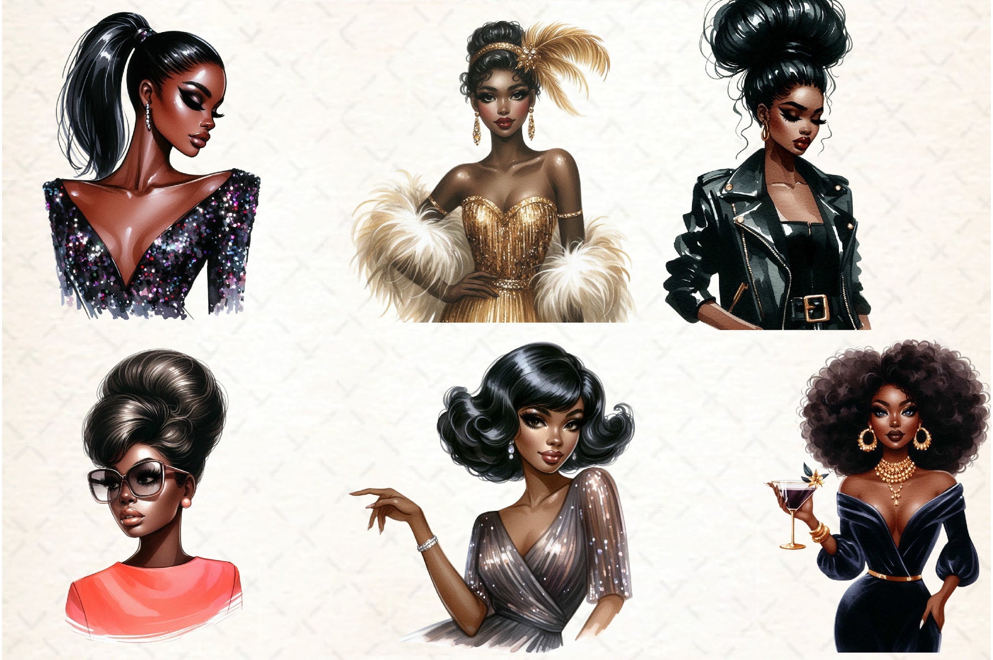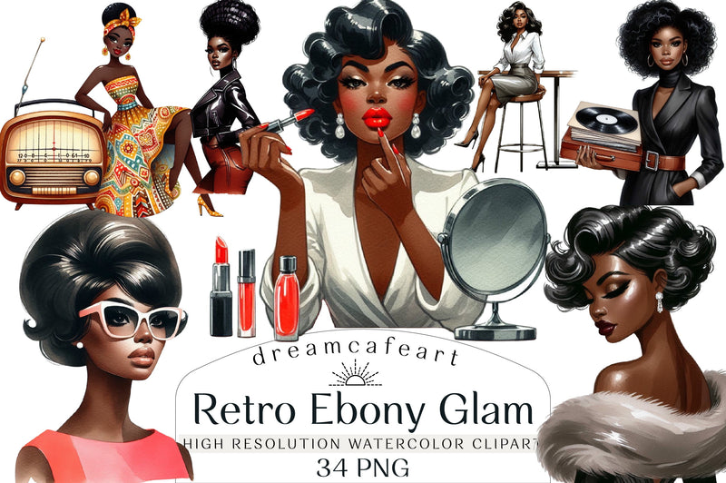 Discover the allure of the Retro Ebony Glam Clipart Bundle, a versatile set of graphics that brings a retro flair to your creative projects, from invitations to digital art.