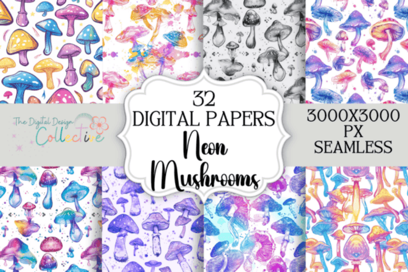 Illuminate your projects with the Seamless Neon Mushroom Digital Paper Collection, featuring vibrant, psychedelic mushroom designs perfect for unique crafts, digital backgrounds, and creative art projects.