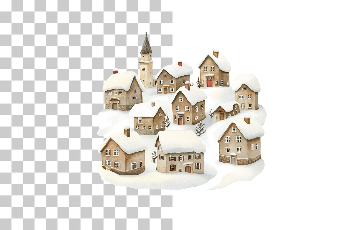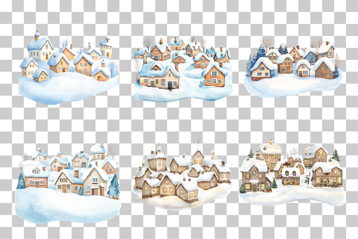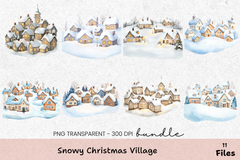 Transform your holiday projects with the Snowy Christmas Village Clipart Bundle, featuring charming winter scenes and festive elements, perfect for creating enchanting holiday cards, crafts, and decorations.