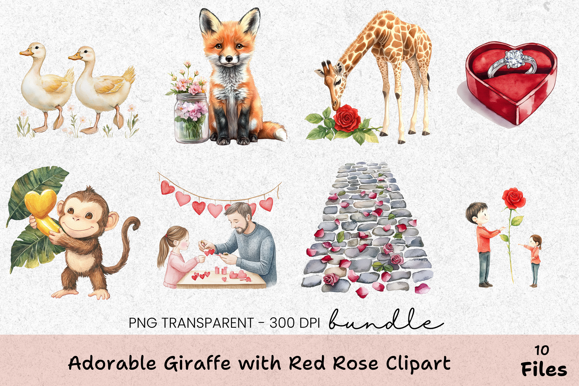Enhance your creative projects with our Adorable Giraffe with Red Rose Clipart Bundle. Perfect for whimsical designs, this charming collection features delightful giraffe illustrations adorned with vibrant red roses. Ideal for nursery decor, greeting cards, and more, these high-quality cliparts bring a touch of elegance and playfulness to any craft. Unleash your imagination and transform your creations with this enchanting bundle today!
