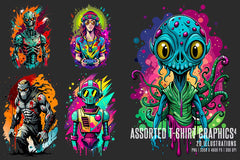 Unleash your style with Assorted T-Shirt Graphics V4 - Funky & Groovy, featuring vibrant and unique designs perfect for making a bold statement. Ideal for fashion enthusiasts looking to add a touch of creativity to their wardrobe.