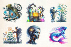 Transform your projects with the Biopunk Character Clipart Bundle, offering a diverse range of high-quality, imaginative characters for all your creative needs.