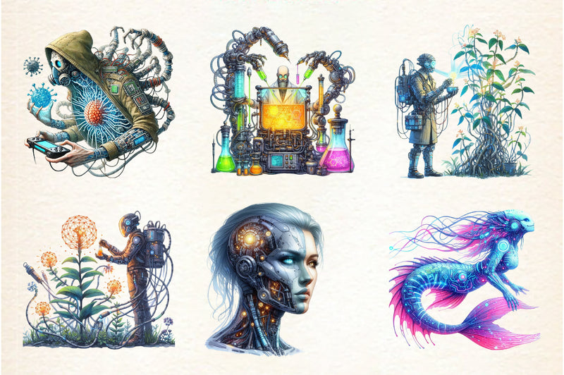 Elevate your artwork with the Biopunk Character Clipart Bundle, a must-have for anyone looking to add a touch of cybernetic flair to their designs.