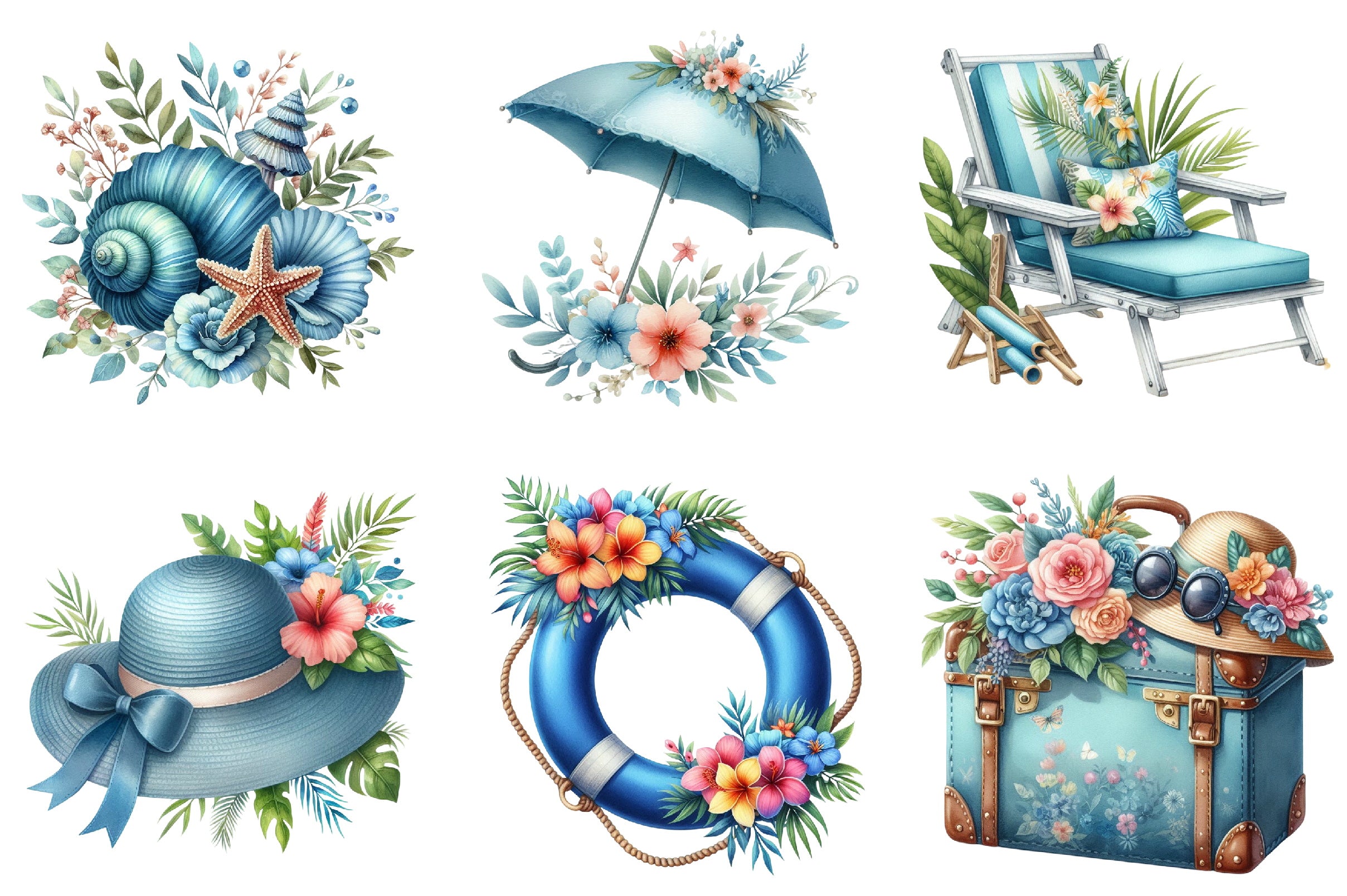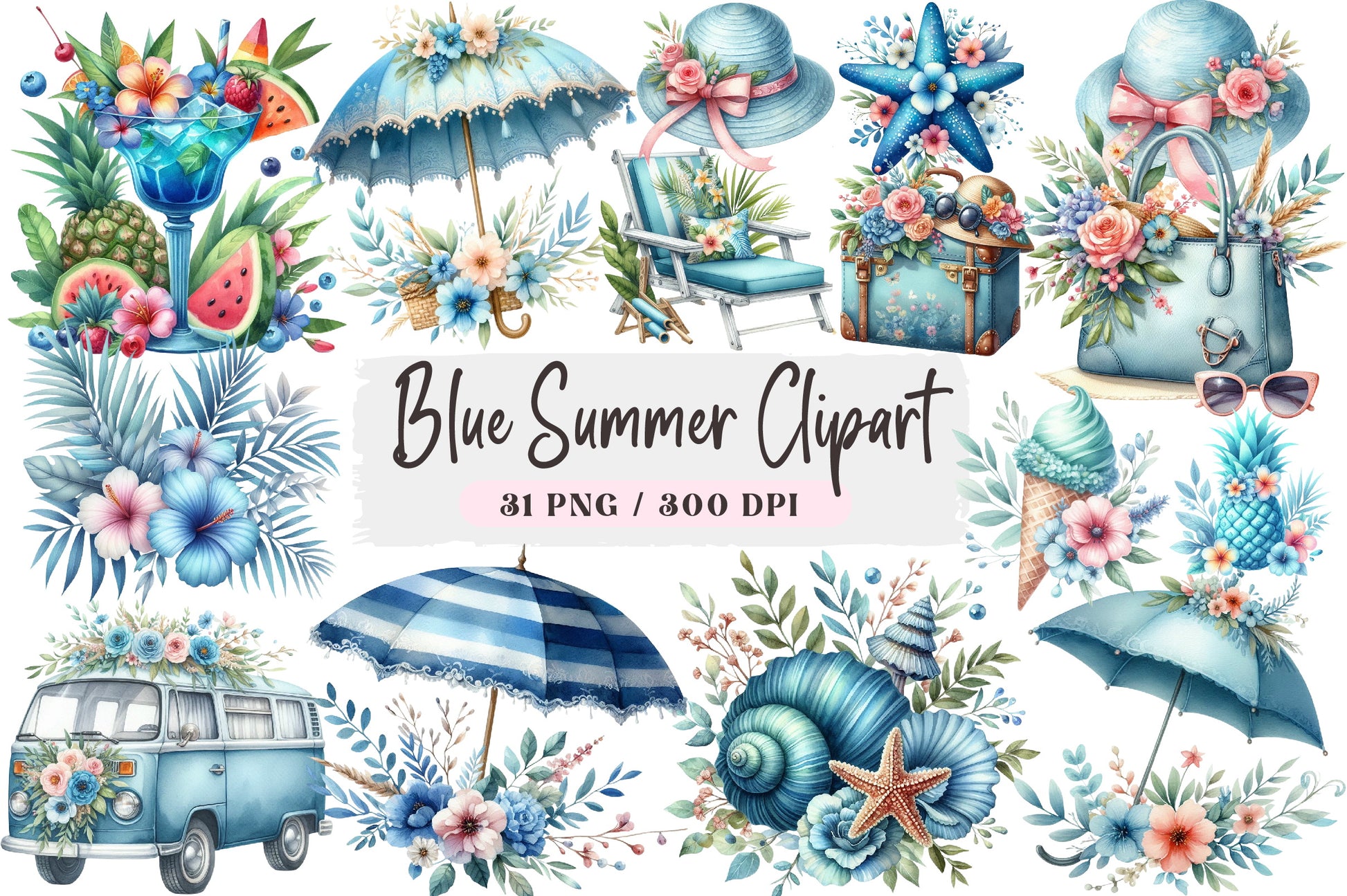 Transform your projects with our Blue Summer Clipart Bundle, offering a diverse range of stunning illustrations to elevate your creative endeavors.