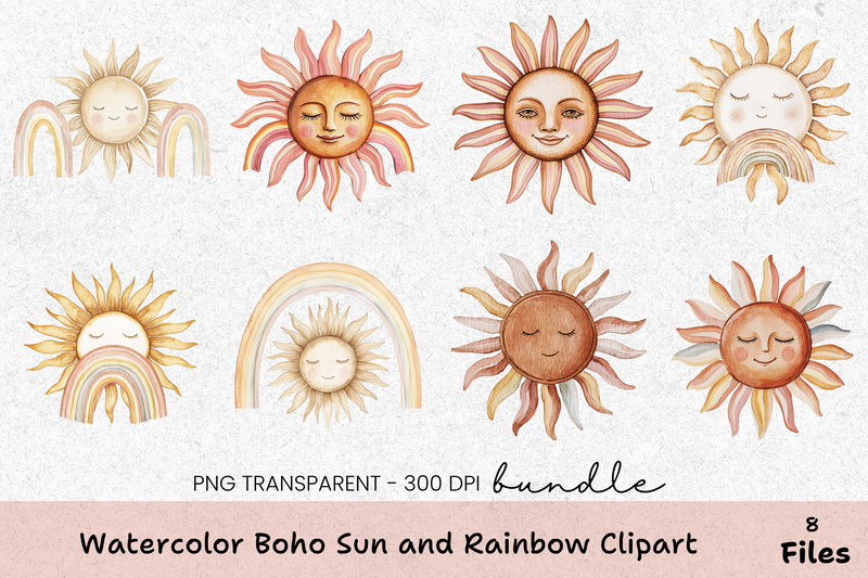 Transform your creative projects with our Boho Sun and Rainbow Clipart Bundle, featuring vibrant, hand-drawn designs perfect for bohemian-themed crafts and decor.