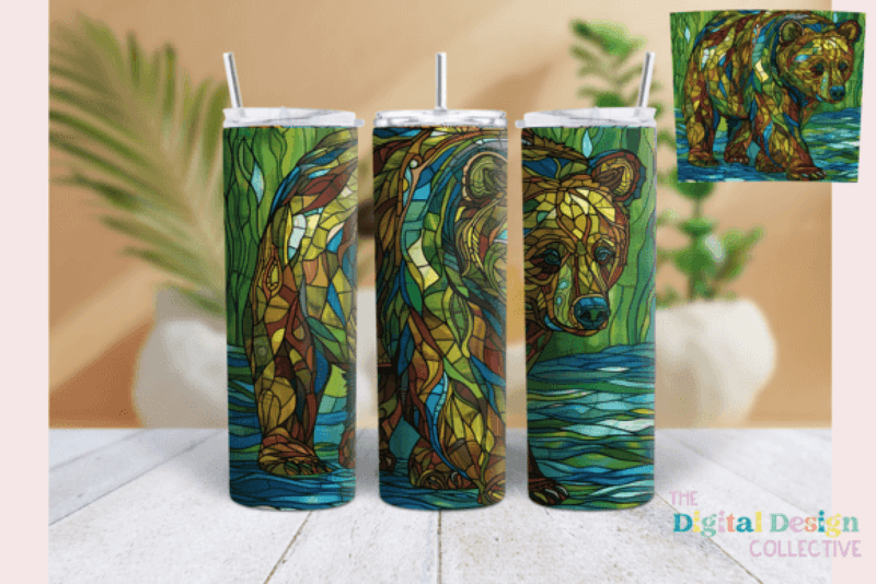 Enhance your space with the Brown Bear Stained Glass 20oz Wrap Design, showcasing intricate bear motifs in vibrant stained glass colors, perfect for nature-inspired decor and unique gift ideas.