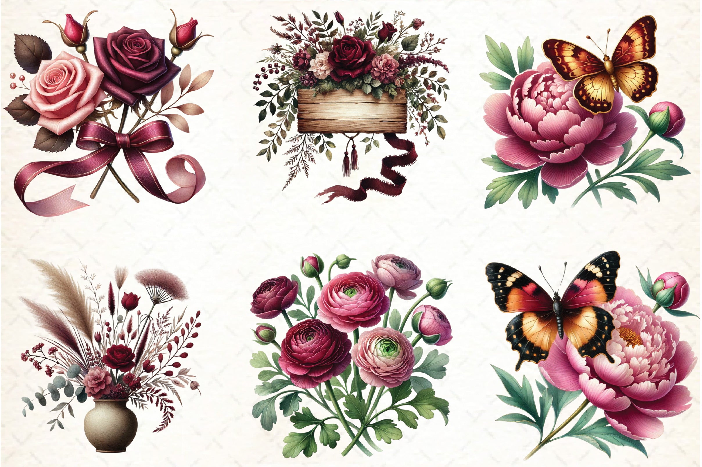 Enhance your creative projects with our Burgundy Spring Clipart Bundle, featuring exquisite floral designs perfect for seasonal crafts, wedding invitations, and digital scrapbooking. Unleash your imagination with these high-quality, versatile graphics that bring a touch of elegance to any project. Ideal for designers, crafters, and DIY enthusiasts looking to add a sophisticated flair to their work.