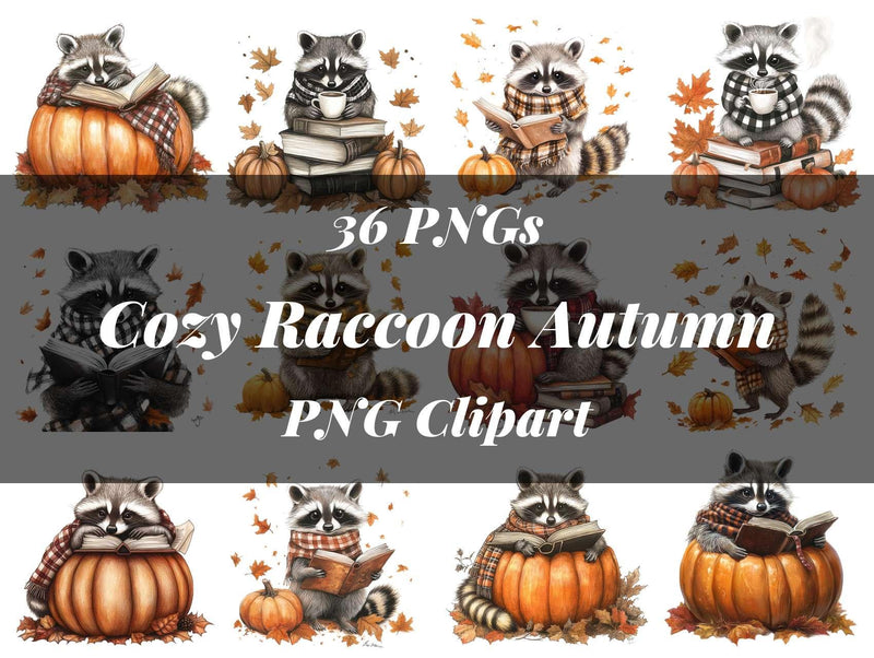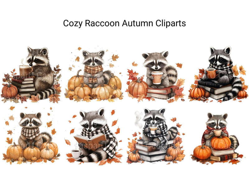 Snuggle up with this Cozy Raccoon Autumn Clipart set, featuring cute raccoons in fall settings, perfect for seasonal projects.
