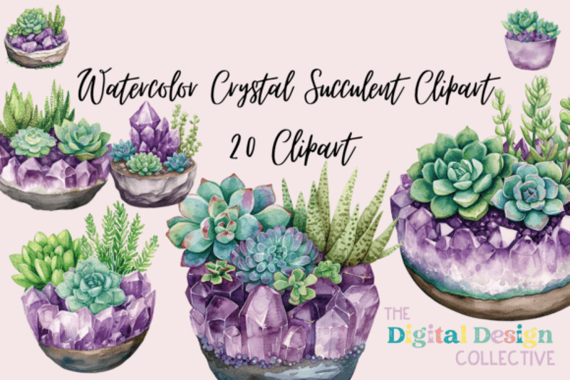 Enhance your creative projects with the Crystal Succulent Clipart Collection Bundle, featuring stunning succulent designs perfect for digital scrapbooking, invitations, and botanical-themed crafts.