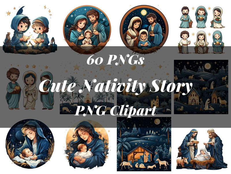Share the story with this Cute Nativity Story Clipart set, featuring adorable nativity scenes, ideal for festive holiday crafts.