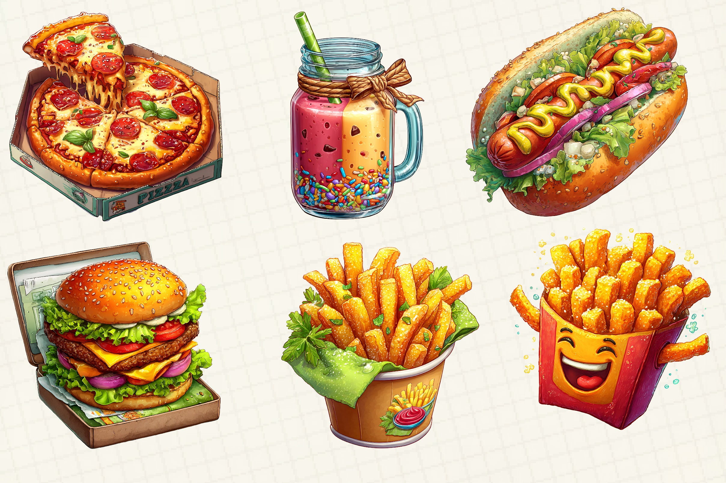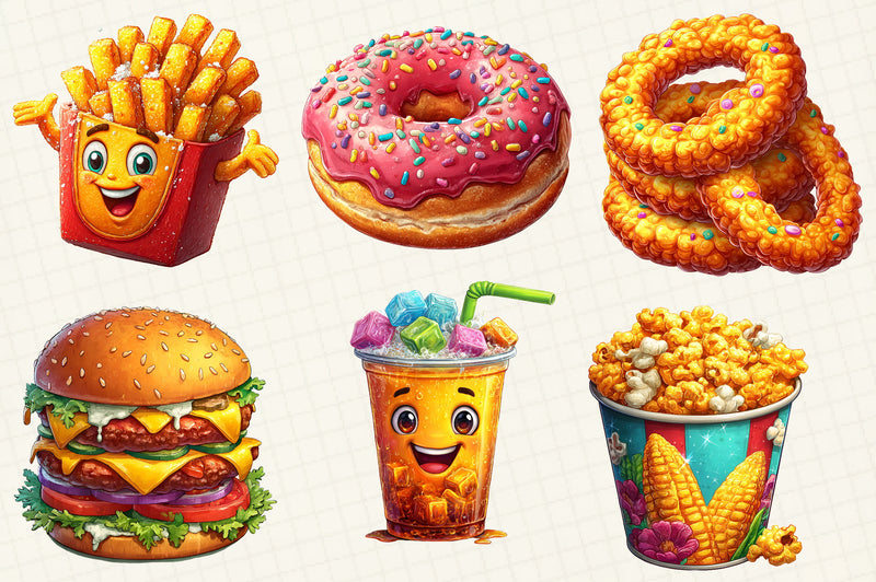 Enhance your creative projects with our Fast Food Clipart Bundle, featuring a diverse collection of vibrant and mouth-watering fast food designs. Perfect for digital scrapbooking, menu designs, and culinary-themed crafts, this bundle offers high-quality illustrations of burgers, fries, pizzas, and more. Ideal for graphic designers, educators, and food enthusiasts looking to add a playful touch to their work. Unleash your creativity and make your projects stand out with this must-have clipart collection.