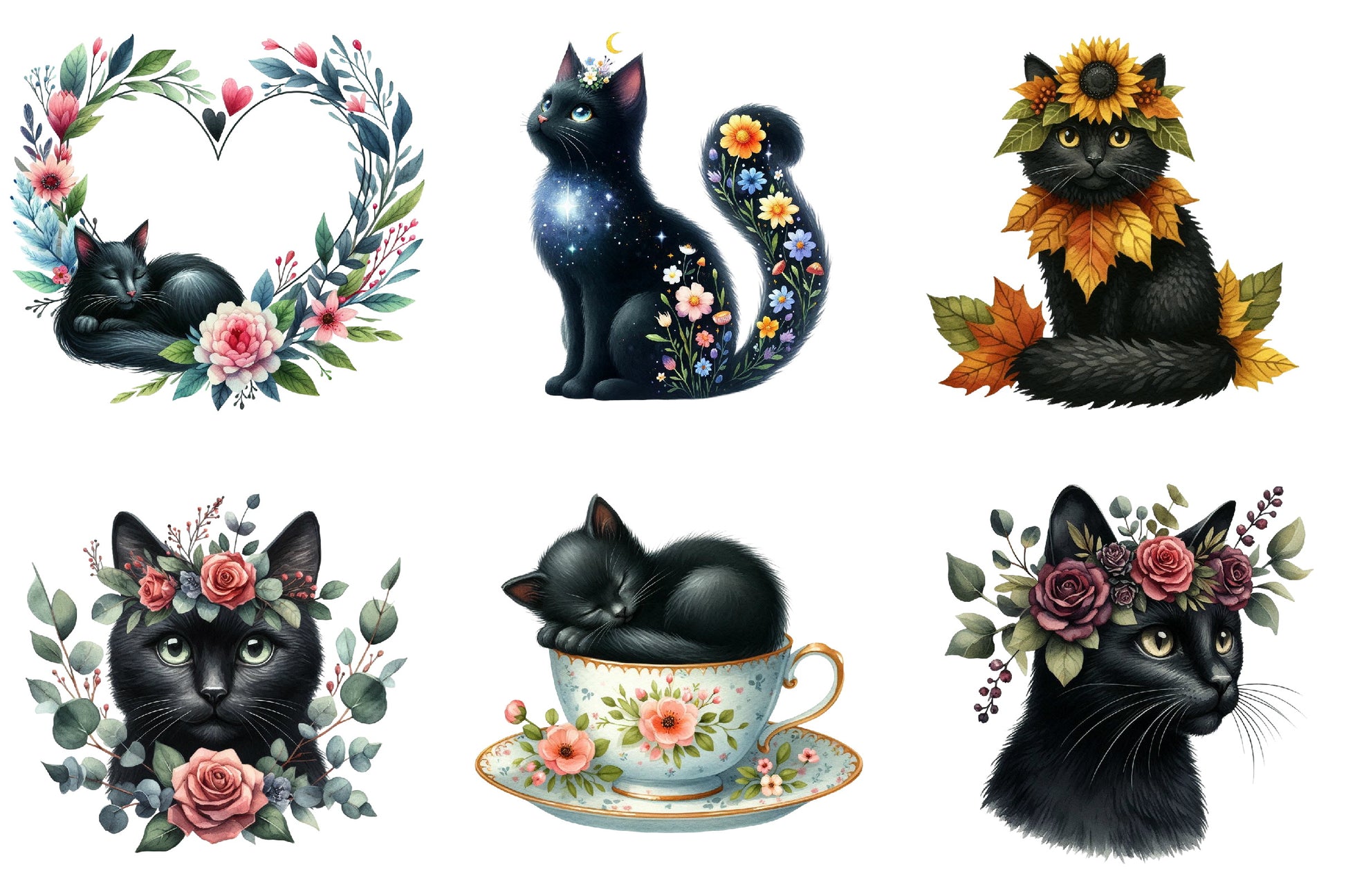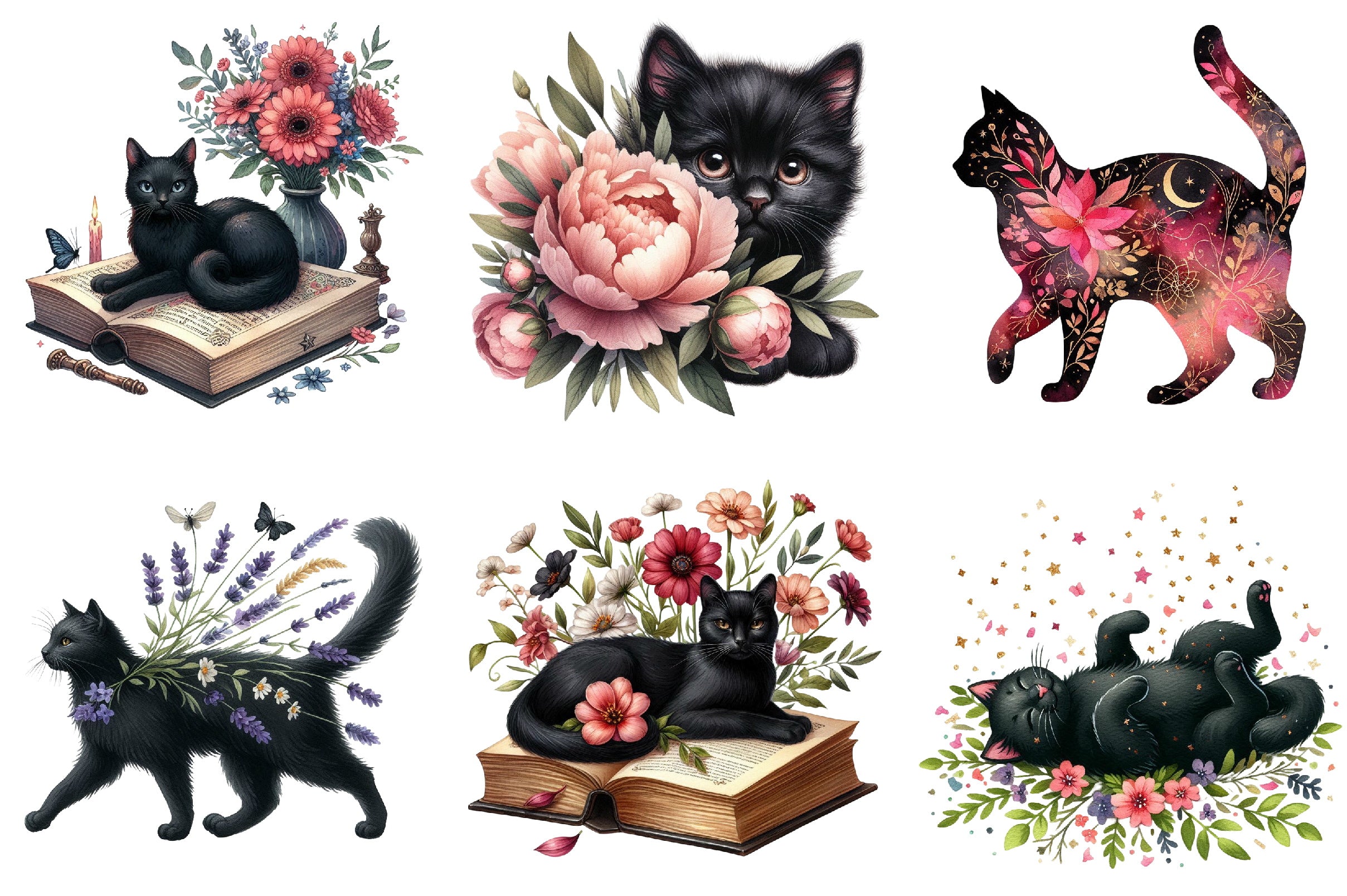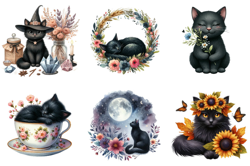 Floral Black Cat Clipart Bundle