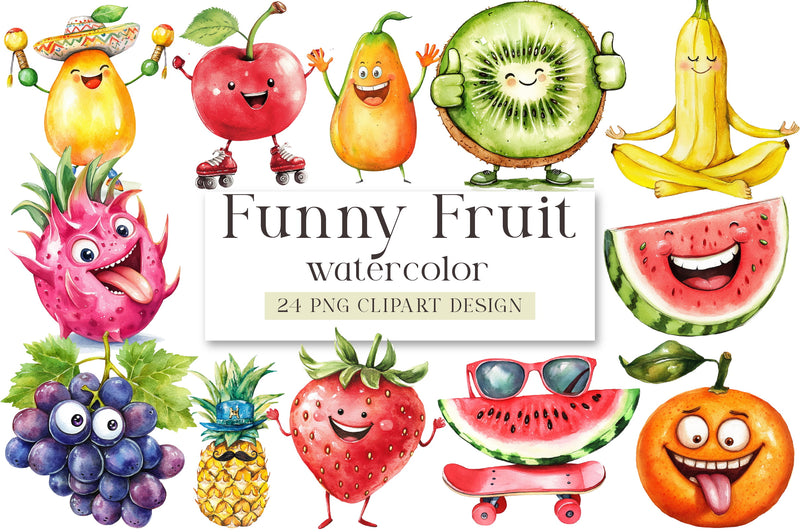 Unleash creativity with our Funny Fruit Clipart Bundle, featuring vibrant and whimsical fruit designs perfect for playful projects and delightful decor.