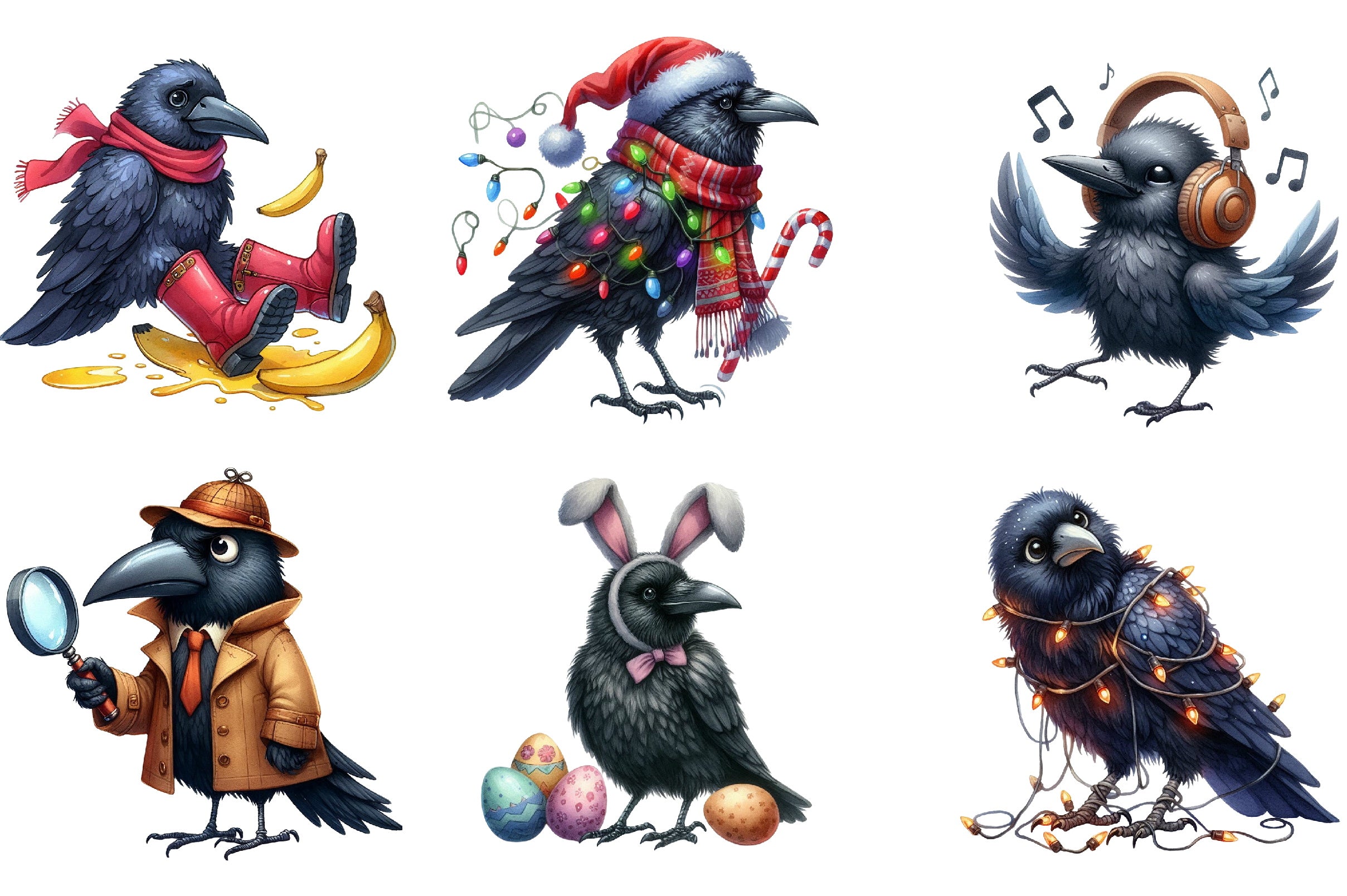 Unleash creativity with our Funny Ravens Clipart Bundle, featuring whimsical raven designs perfect for quirky crafts and unique projects. Ideal for digital scrapbooking, invitations, and more, these high-quality illustrations add a touch of humor and charm to any creation. Elevate your designs with this versatile collection, perfect for both personal and commercial use.