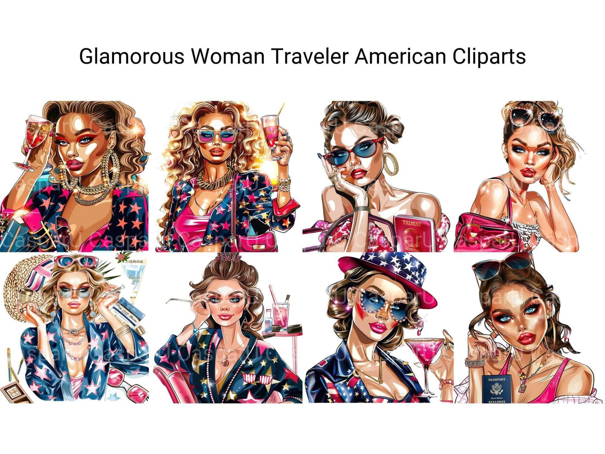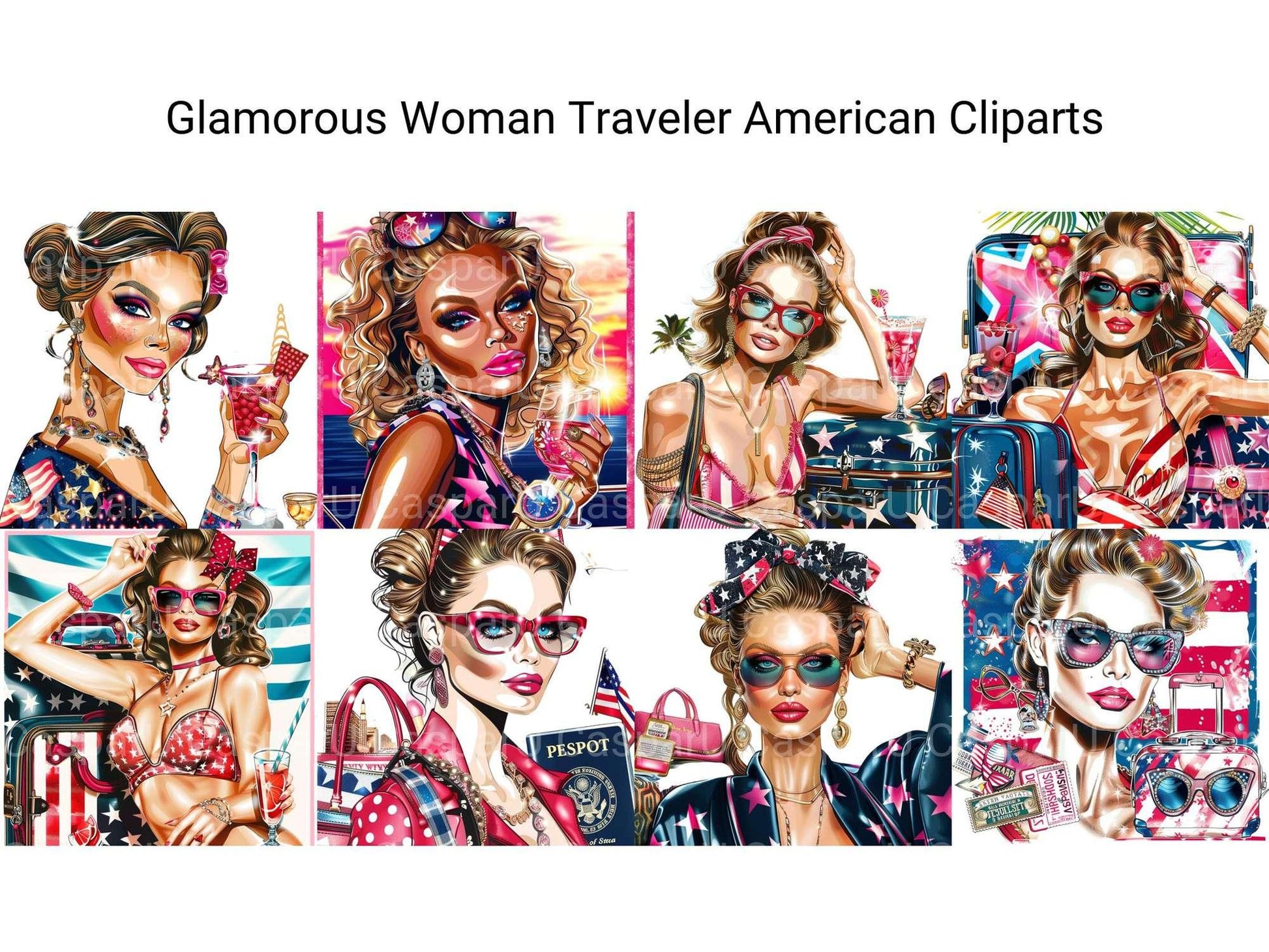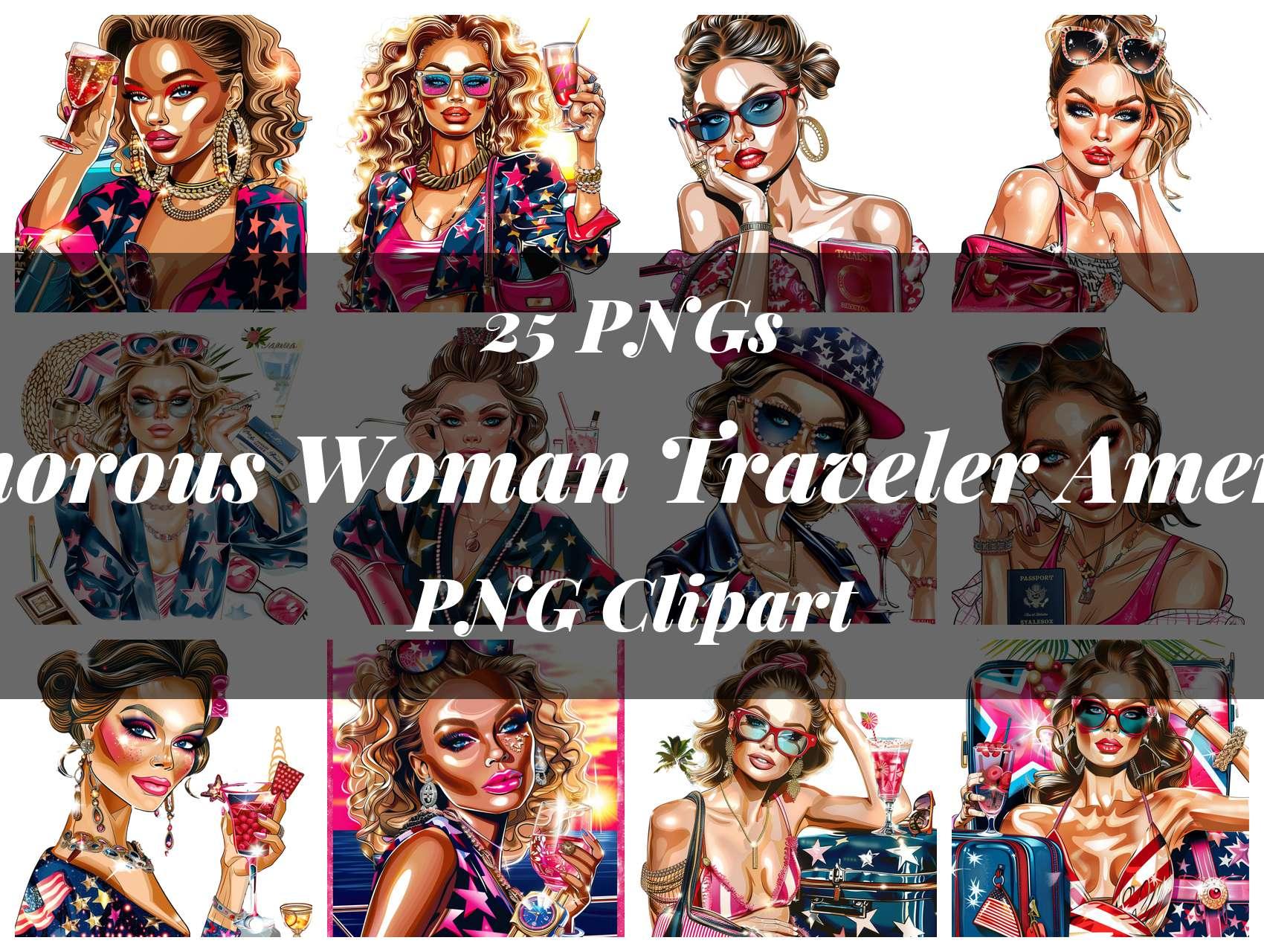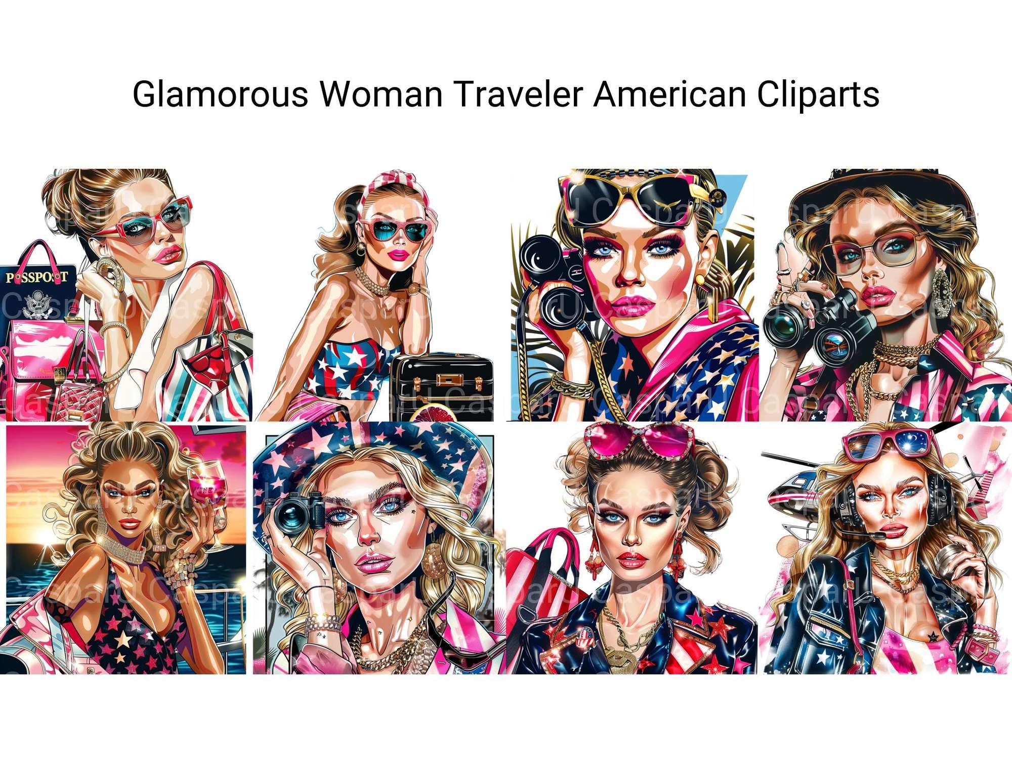Travel in style with this Glamorous Woman Traveler American Clipart set, featuring chic designs, ideal for glamorous travel projects.