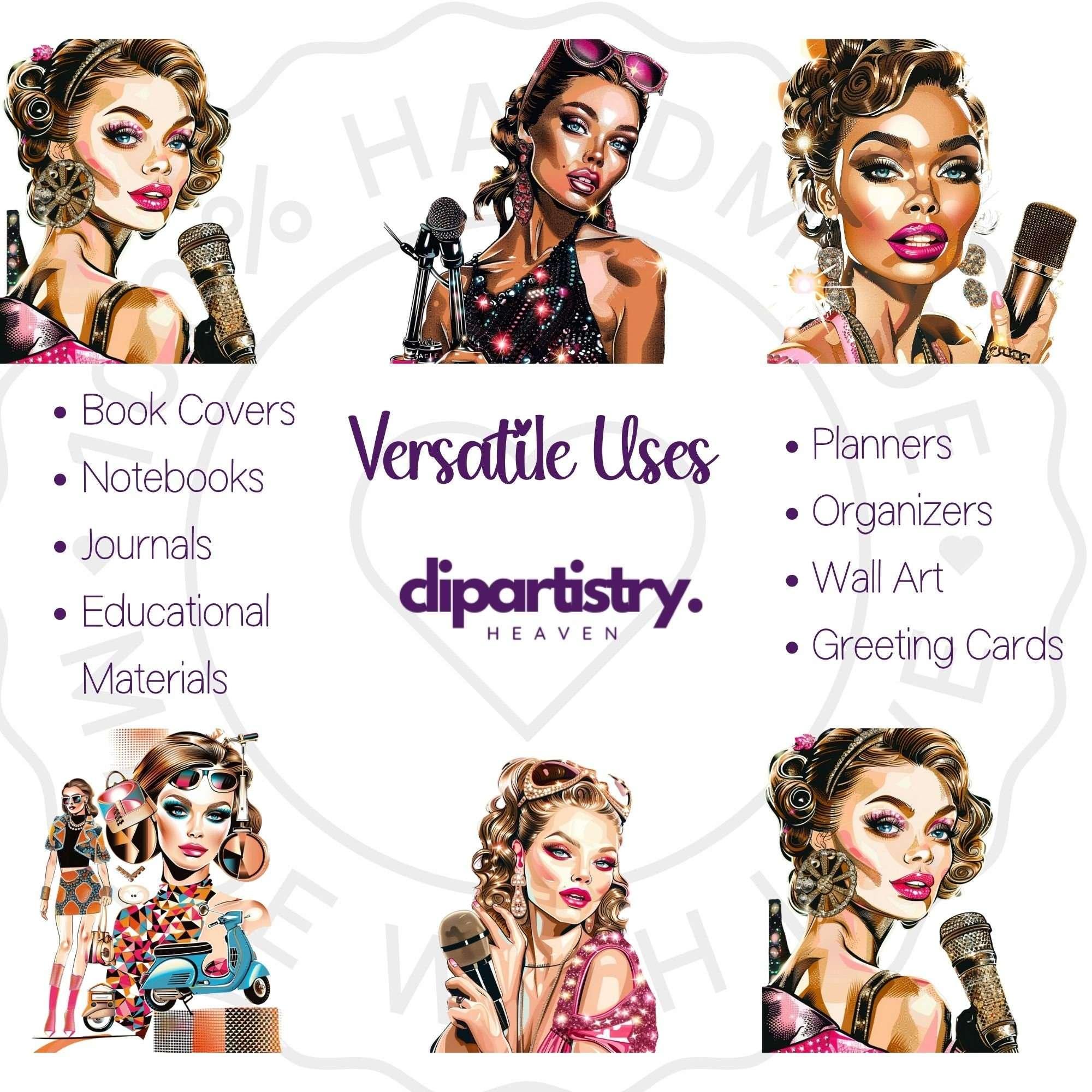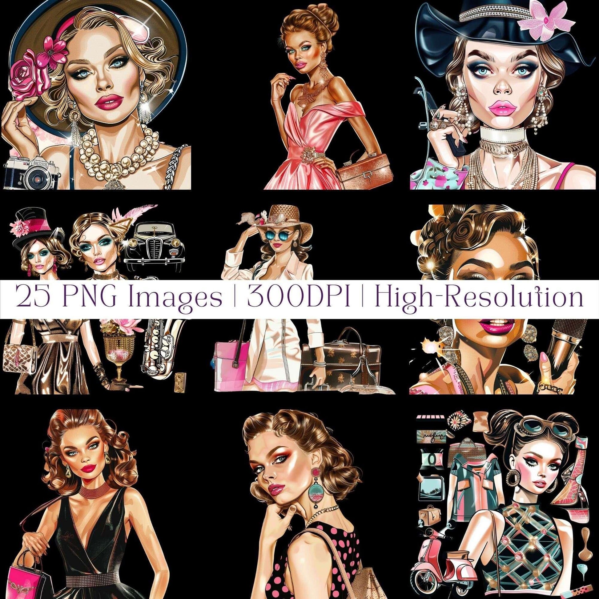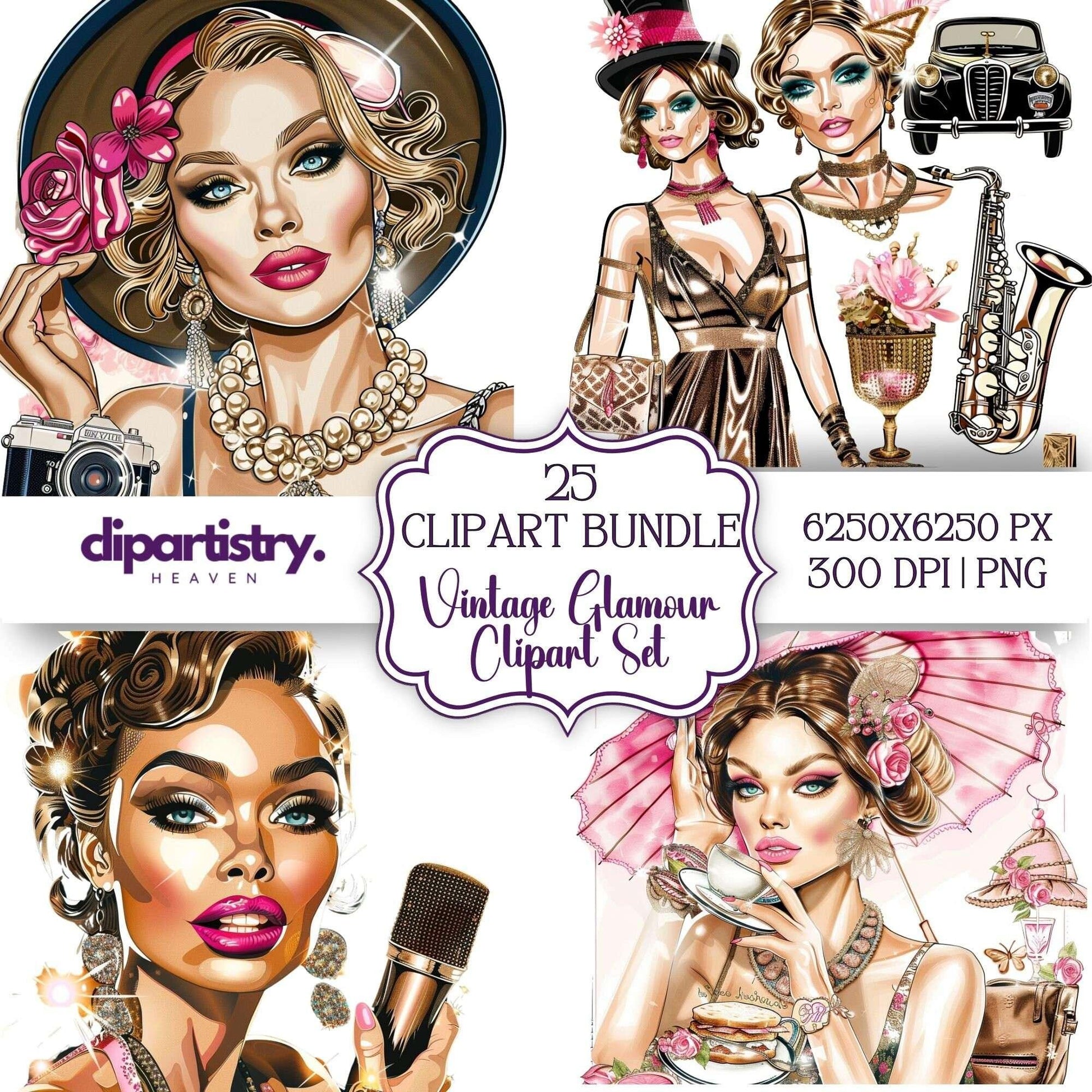 Shine with this Vintage Glamour Clipart set, featuring elegant retro designs, ideal for stylish fashion projects.