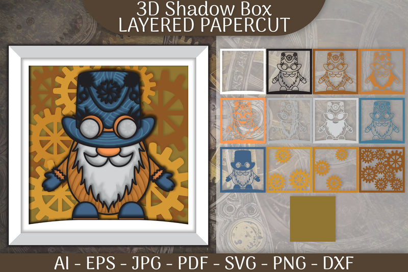 Discover the enchanting world of the Gnome Steampunk 3D Shadowbox Papercut SVG Bundle, featuring intricate designs perfect for unique home decor and creative crafting projects. Ideal for steampunk enthusiasts and papercraft lovers, this bundle offers endless possibilities for personalized gifts and artistic expression.