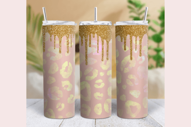 Unleash your wild side with the Gold Glitter Leopard Tumbler Wrap Design, featuring a dazzling leopard print with shimmering gold accents, perfect for adding a touch of glamour to your drinkware collection.