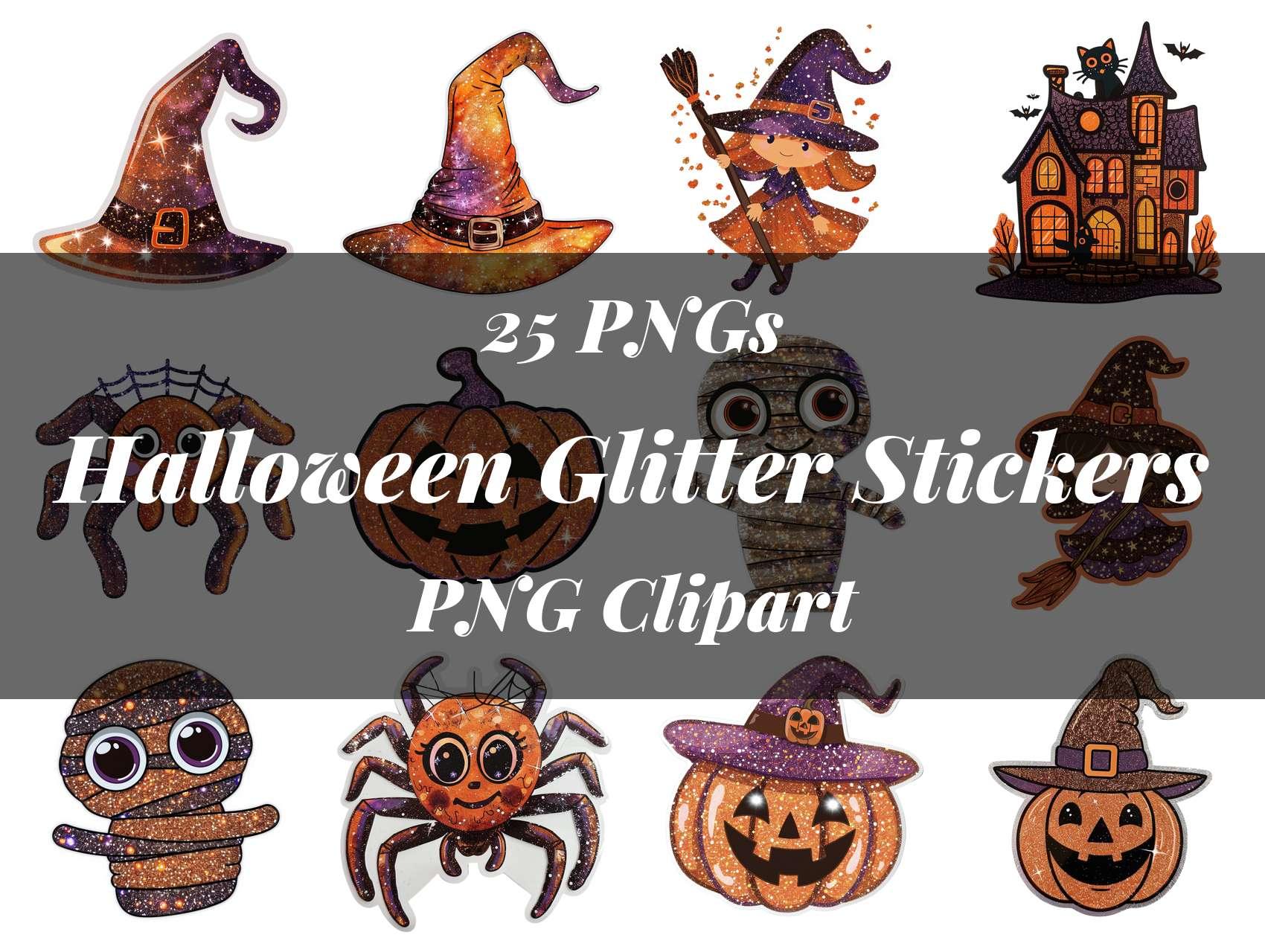 Shimmer with this Halloween Glitter Stickers Clipart set, featuring sparkling spooky designs, ideal for festive crafts.