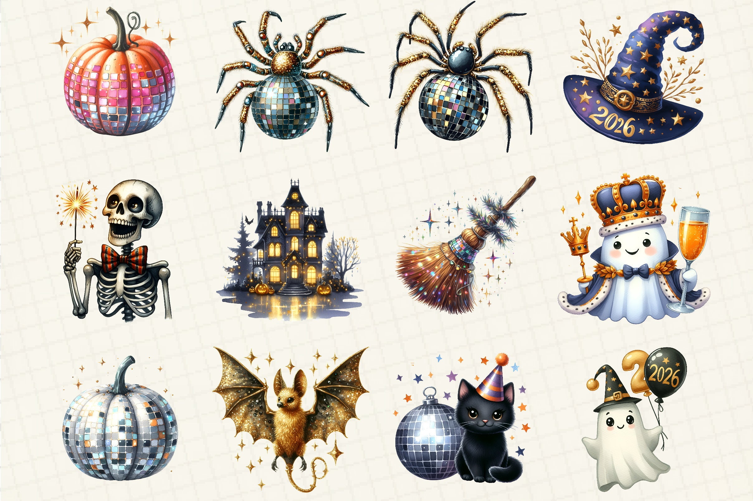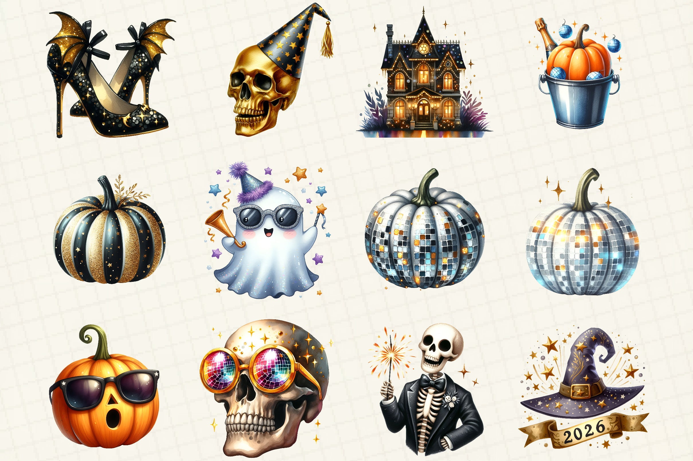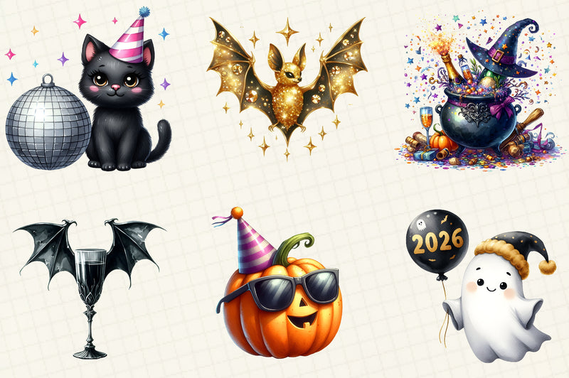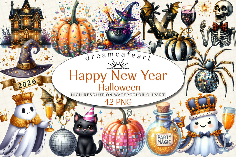 Celebrate the season with our Happy New Year Halloween Clipart Bundle! Perfect for crafting spooky yet festive designs, this collection features a variety of high-quality, unique illustrations. Ideal for party invitations, decorations, and digital projects, these cliparts will add a magical touch to your Halloween and New Year celebrations. Unleash your creativity and transform your projects with this versatile bundle today!