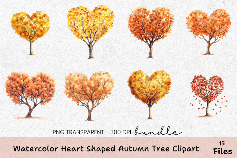 Transform your creative projects with our Heart Shaped Autumn Tree Clipart Bundle. Perfect for seasonal designs, this collection features vibrant, heart-shaped trees in stunning autumn hues. Ideal for invitations, scrapbooking, and digital art, these high-quality images bring warmth and charm to any project. Capture the essence of fall with this versatile clipart set, perfect for both personal and commercial use. Elevate your designs with the beauty of autumn's heart.