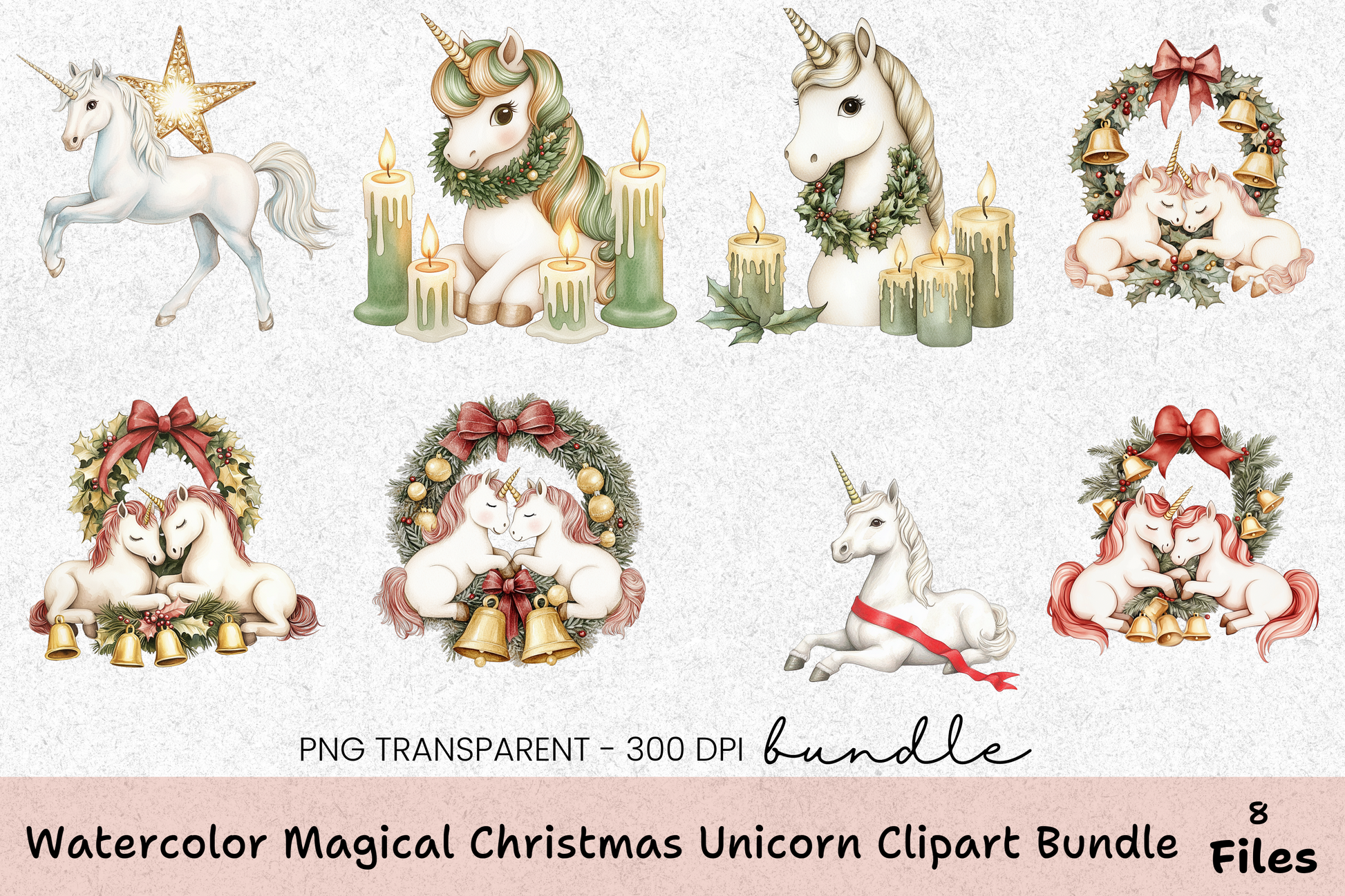 Unleash holiday magic with our Magical Christmas Unicorn Clipart Bundle, featuring whimsical unicorn designs perfect for festive crafts and enchanting holiday projects.