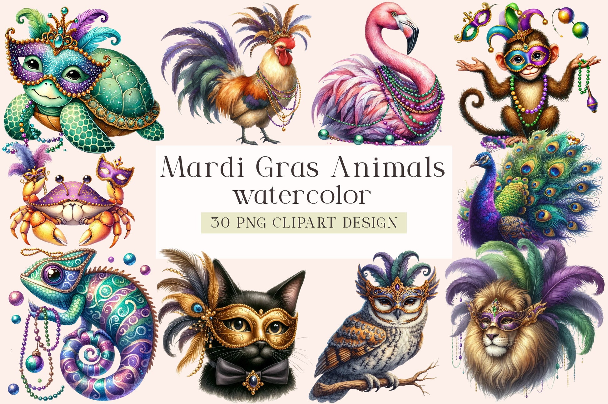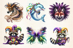 Celebrate in style with our exclusive Mardi Gras Animal Clipart Bundle, offering a colorful array of animal graphics to enhance your creative endeavors.