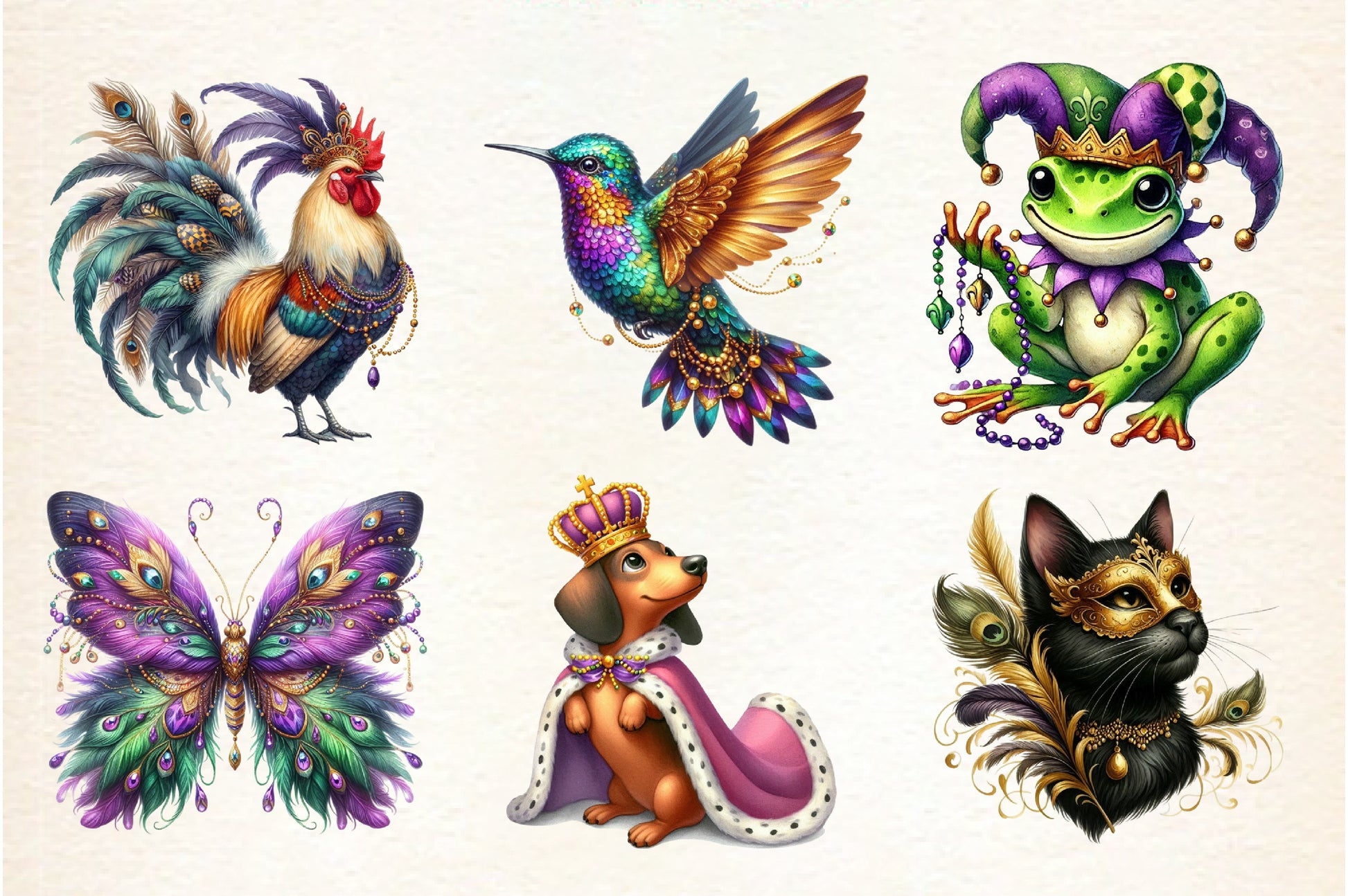 Transform your projects with this unique collection of Mardi Gras-themed animal illustrations, ideal for digital scrapbooking, DIY crafts, and more.