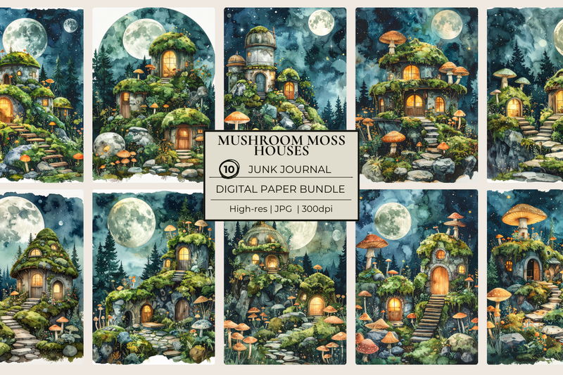 Discover the enchanting world of Mushroom Moss Houses Junk Journal Papers, perfect for crafting whimsical journals and scrapbooks. These unique designs bring a touch of nature's magic to your creative projects, ideal for nature-themed crafts and storytelling.