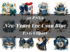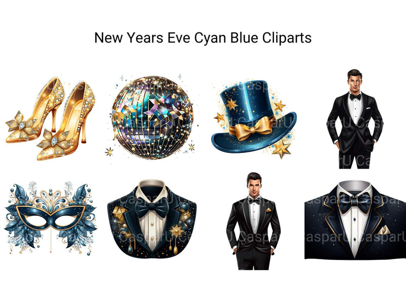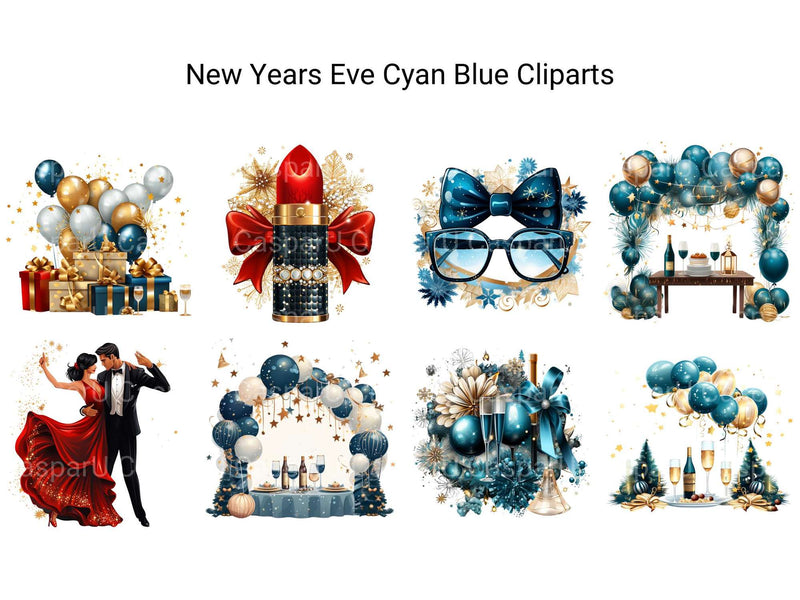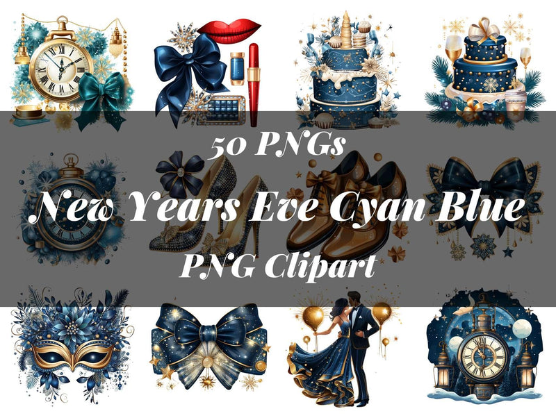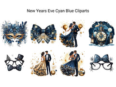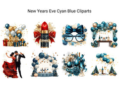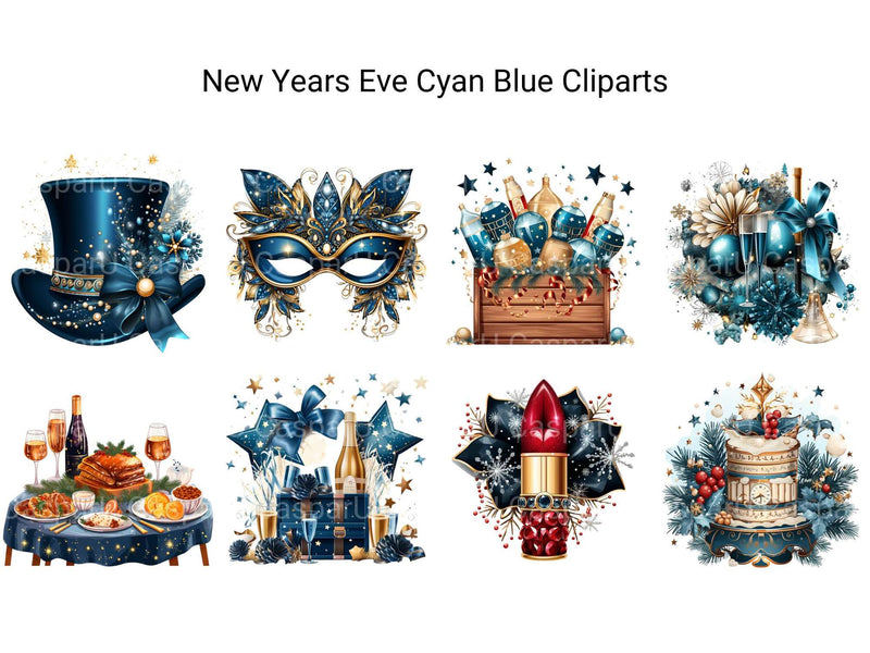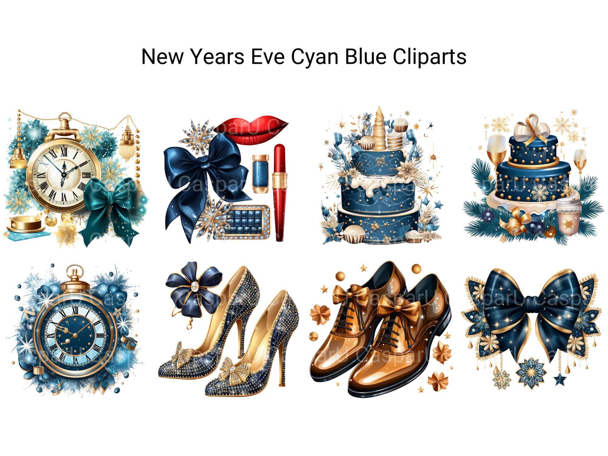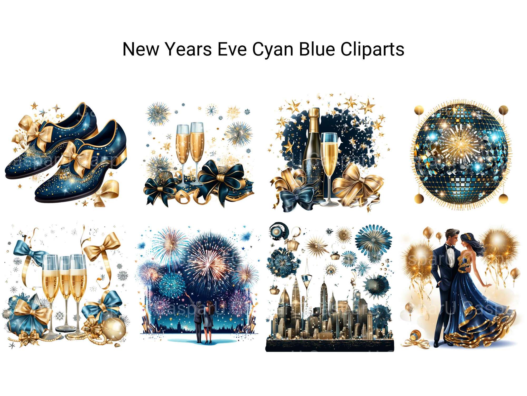 Ring in the new year with this New Years Eve Cyan Blue and Gold Clipart set, featuring stylish designs, perfect for festive crafts.