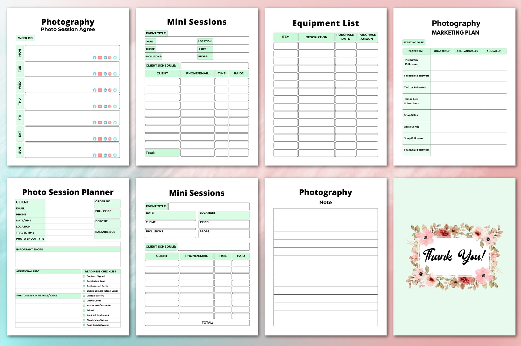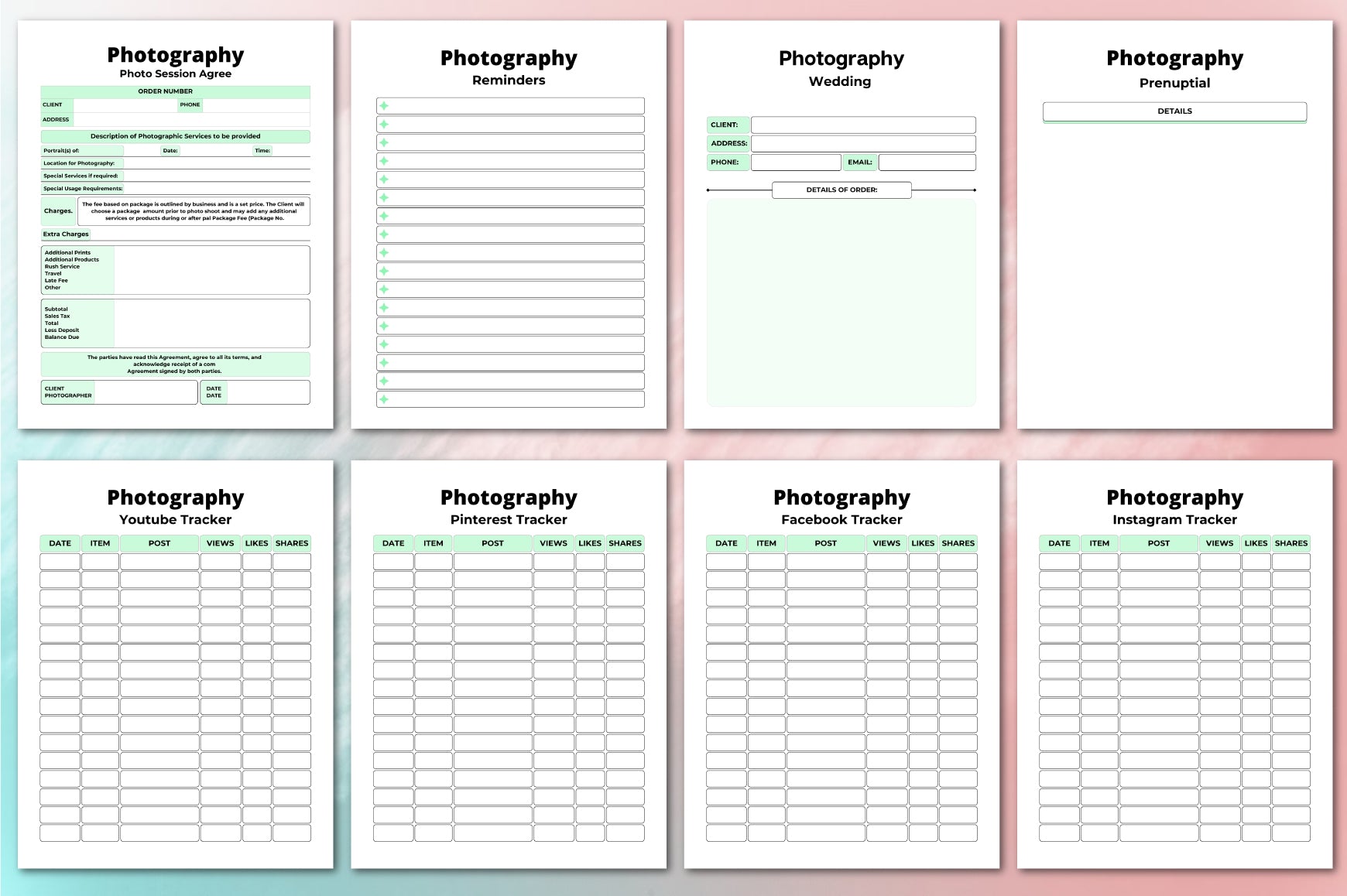 Capture your creative journey with our Photography Planner, designed to organize your shoots, track progress, and inspire new ideas. Perfect for photographers of all levels, this planner features customizable layouts, goal-setting pages, and space for notes, ensuring you never miss a moment of inspiration. Elevate your photography skills and streamline your workflow with this essential tool, ideal for both professional and hobbyist photographers seeking to enhance their craft.