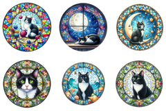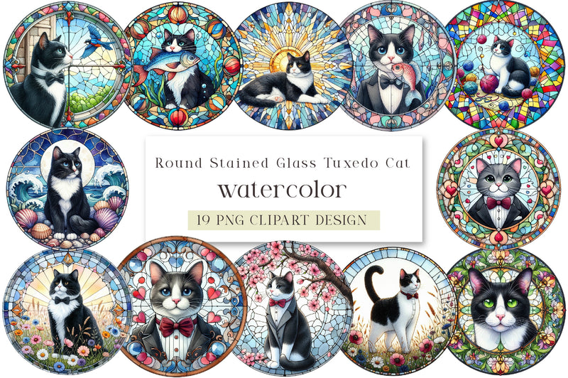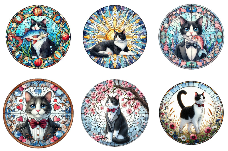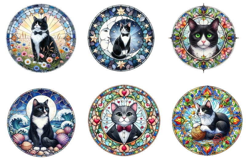 Round Stained Glass Tuxedo Cat Clipart Bundle