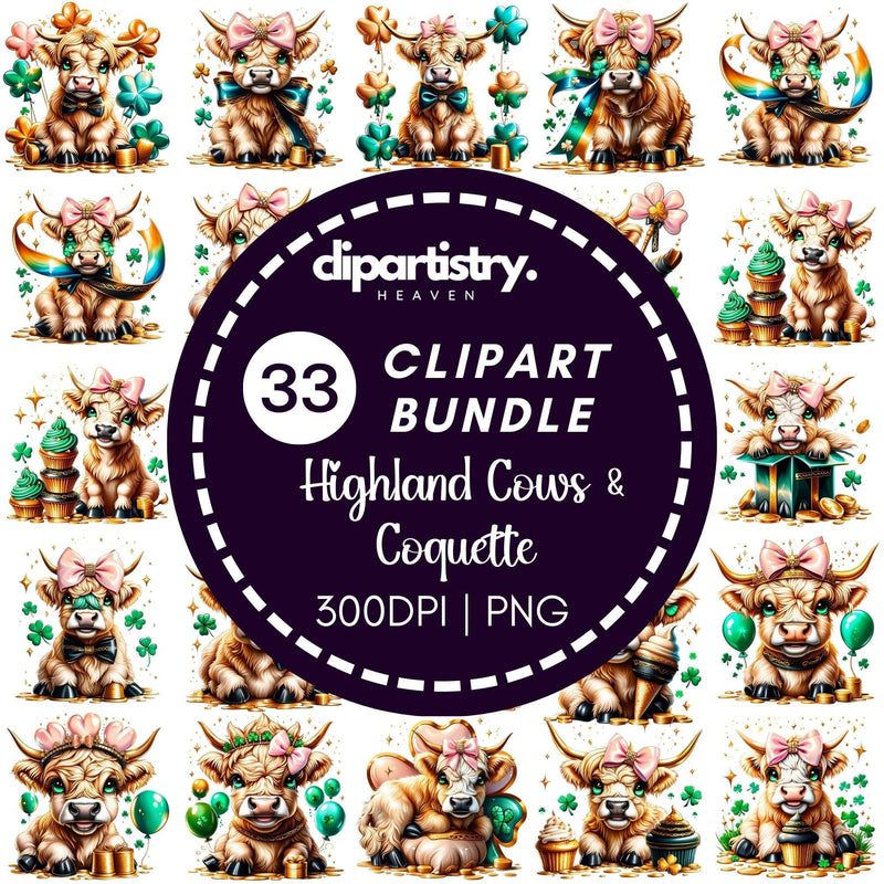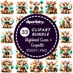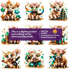 Moo-ve into luck with this St. Patrick’s Highland Cow Coquette Clipart set, featuring cute cow designs, perfect for Irish-themed crafts.