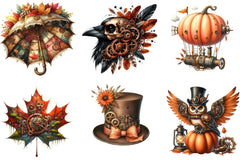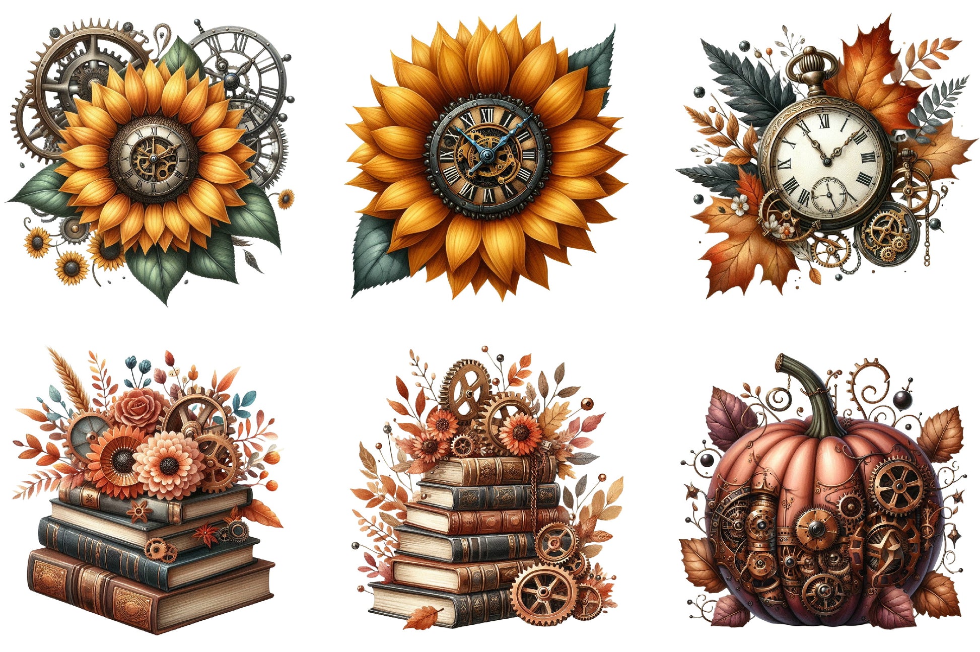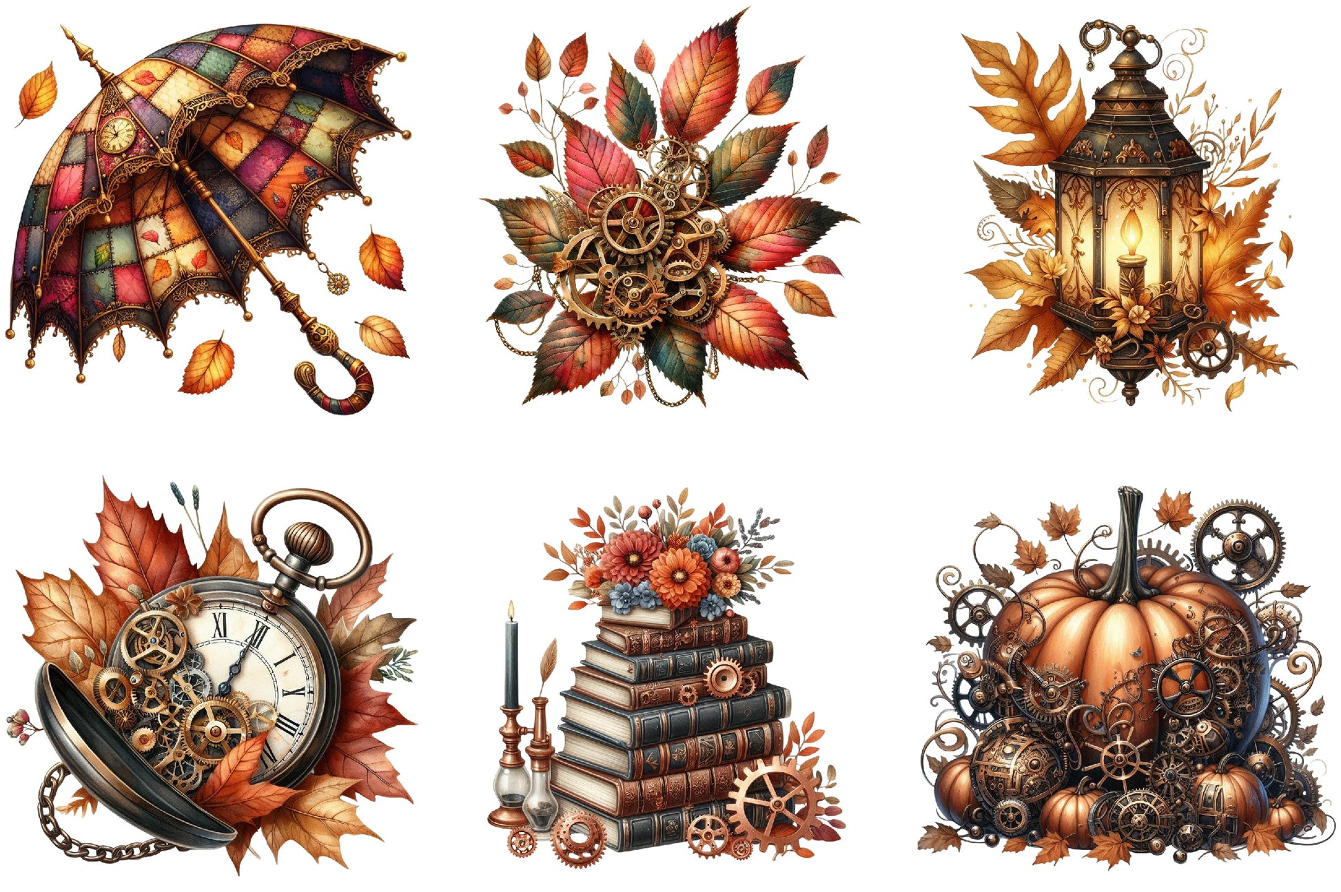 Explore the fusion of steampunk aesthetics and autumn charm with our versatile clipart bundle, designed to enhance your artistic projects with intricate details and seasonal flair.