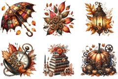 Elevate your designs with the Steampunk Autumn Clipart Bundle, offering a rich assortment of high-quality images that capture the essence of fall with a mechanical twist.