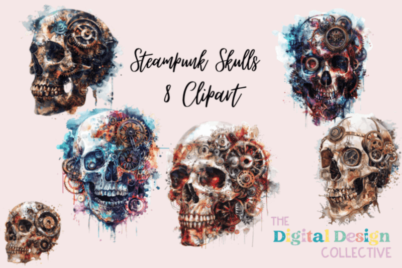 Unleash creativity with the Steampunk Skulls Clipart Bundle, featuring intricately designed skulls perfect for unique crafts, digital art, and themed projects. Ideal for adding a vintage twist to your creations.