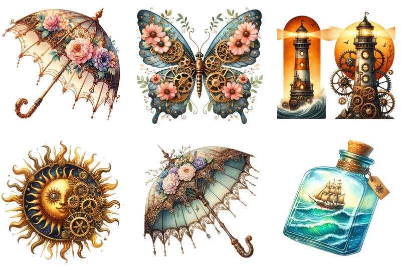 Unleash creativity with the Steampunk Summer Clipart Bundle, featuring unique vintage designs perfect for crafting, scrapbooking, and digital projects. Dive into a world of gears and goggles with this versatile collection, ideal for adding a touch of retro-futuristic charm to your creations. Perfect for artists, designers, and DIY enthusiasts looking to enhance their projects with a steampunk twist.