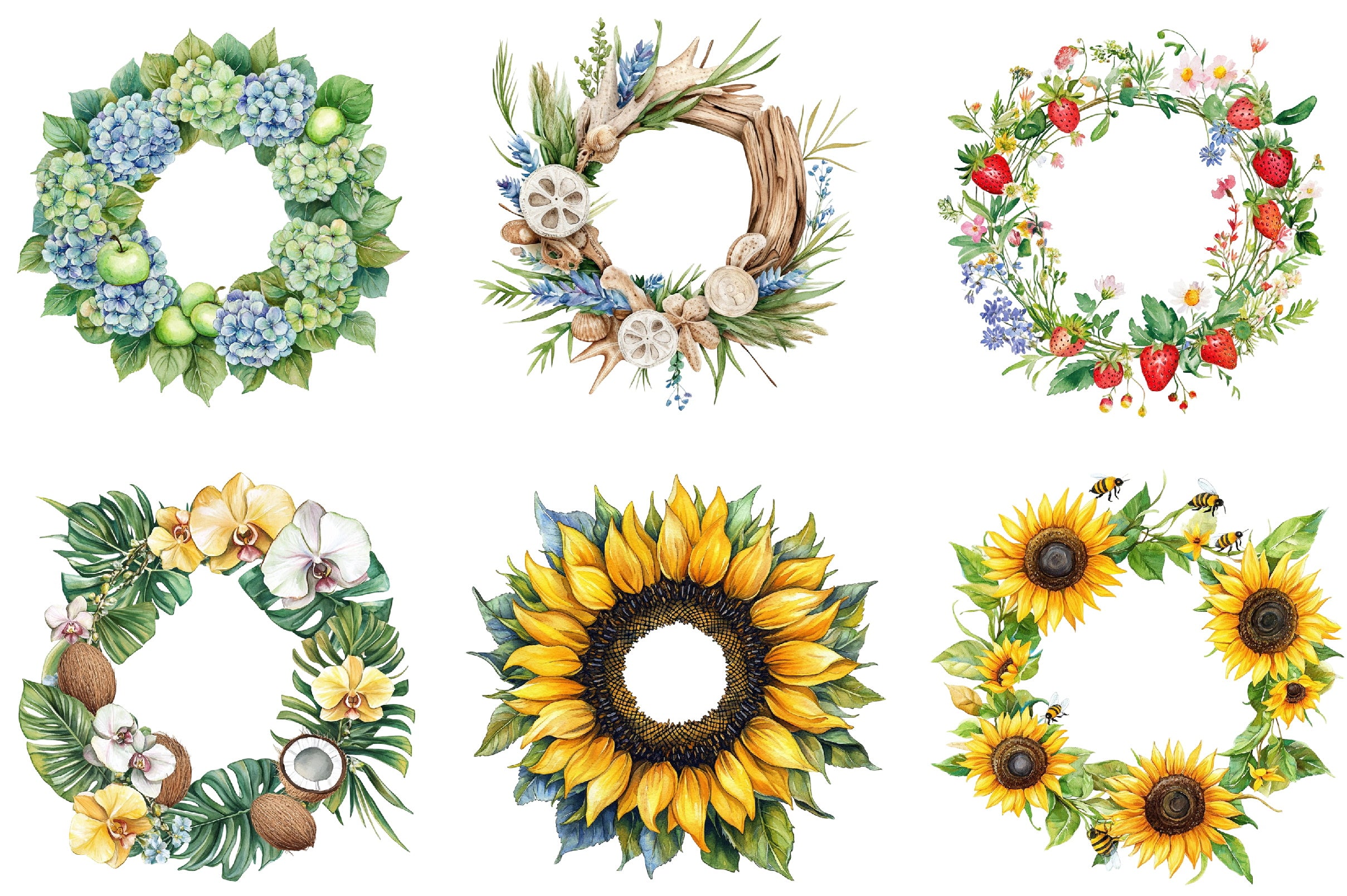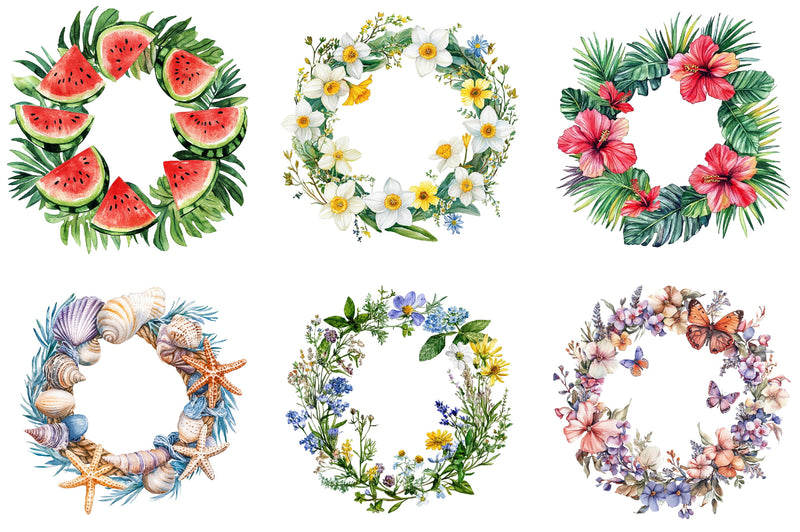 Enhance your seasonal projects with our Summer Wreath Clipart Bundle, featuring vibrant floral designs perfect for invitations, scrapbooking, and home decor. Capture the essence of summer with these high-quality, versatile illustrations, ideal for DIY crafts and digital creations. Transform your creative ideas into reality with this must-have collection, designed to bring a touch of sunshine to any project.